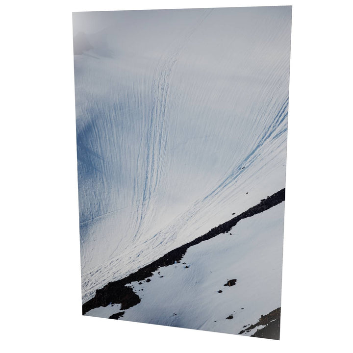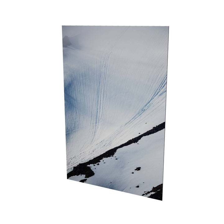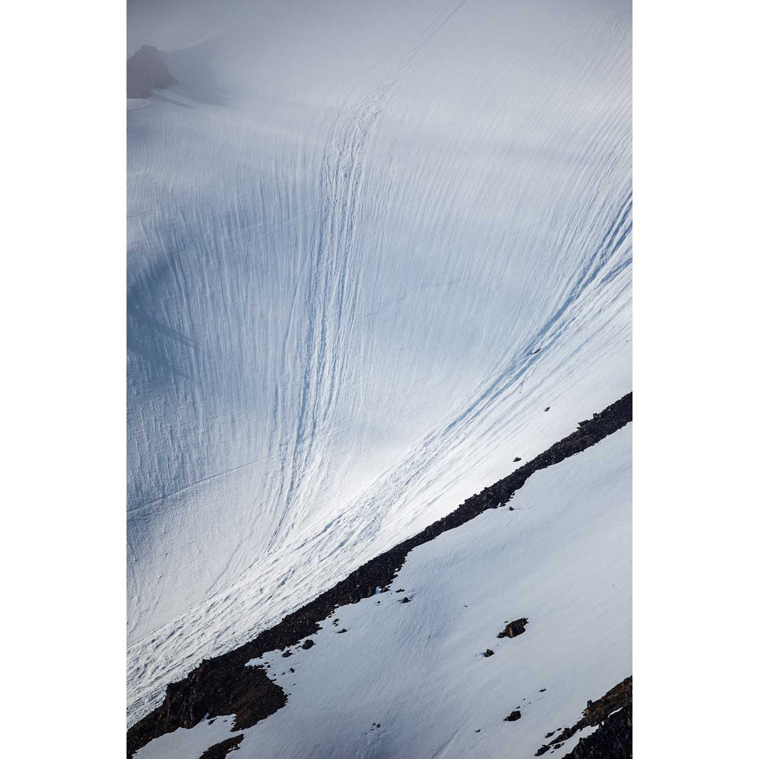 The photograph captures an intricate dance of shadows and light on a steep mountain snowfield in Svalbard. The gentle curves and undulating patterns in the snow contrast beautifully with the rugged patches of rock that peek through. This striking composition invites viewers to explore the delicate balance between softness and strength. Imagine this breathtaking scene adorning your wall, bringing a sense of calm and grandeur to your space.