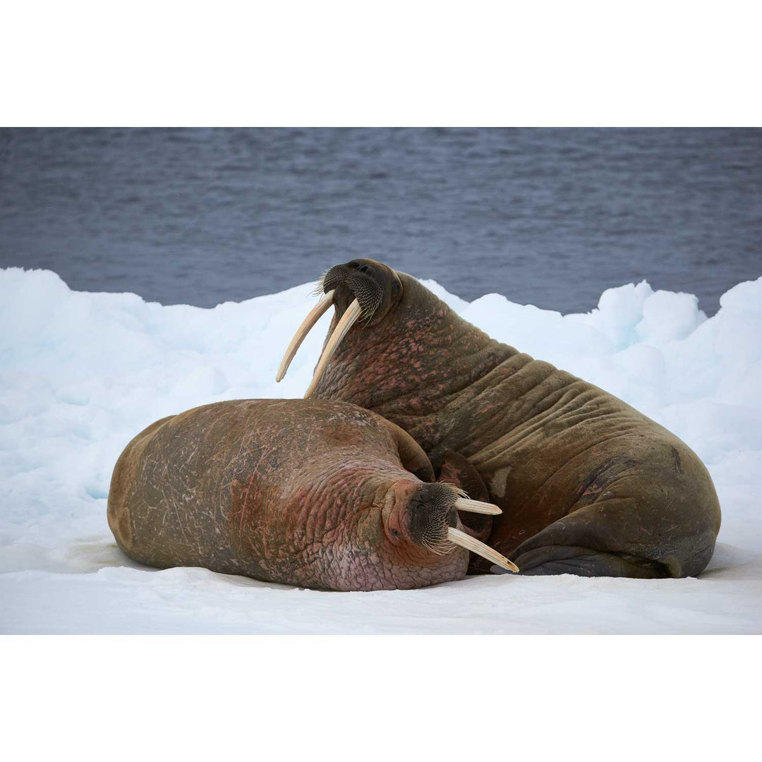 In the icy seclusion of Svalbard, two walruses bask lazily on a snow-covered floe, embodying the perfect image of Arctic leisure. Their chunky forms sprawled comfortably against the crisp white backdrop bring a sense of humor and charm to the stark landscape. Imagine these gentle giants adding a touch of whimsy to your living room wall, inviting conversation and smiles from guests.