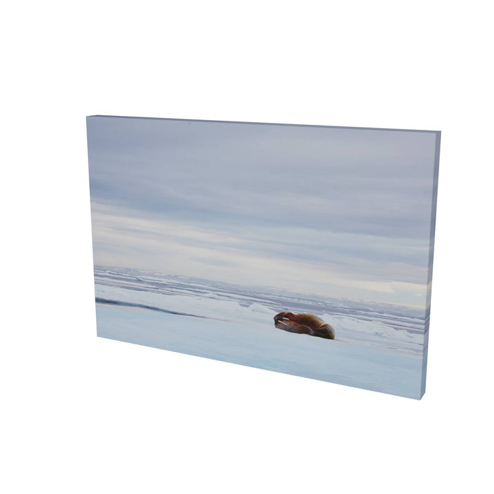 Amidst the endless stretch of icy blues and whites, a walrus seems to have found the perfect spot for a nap. Its seemingly exasperated pose, with a flipper dramatically slung over its face, adds a touch of humor to the stark Arctic landscape. Imagine this print on your wall, adding a dash of whimsy and wonder to your everyday view.