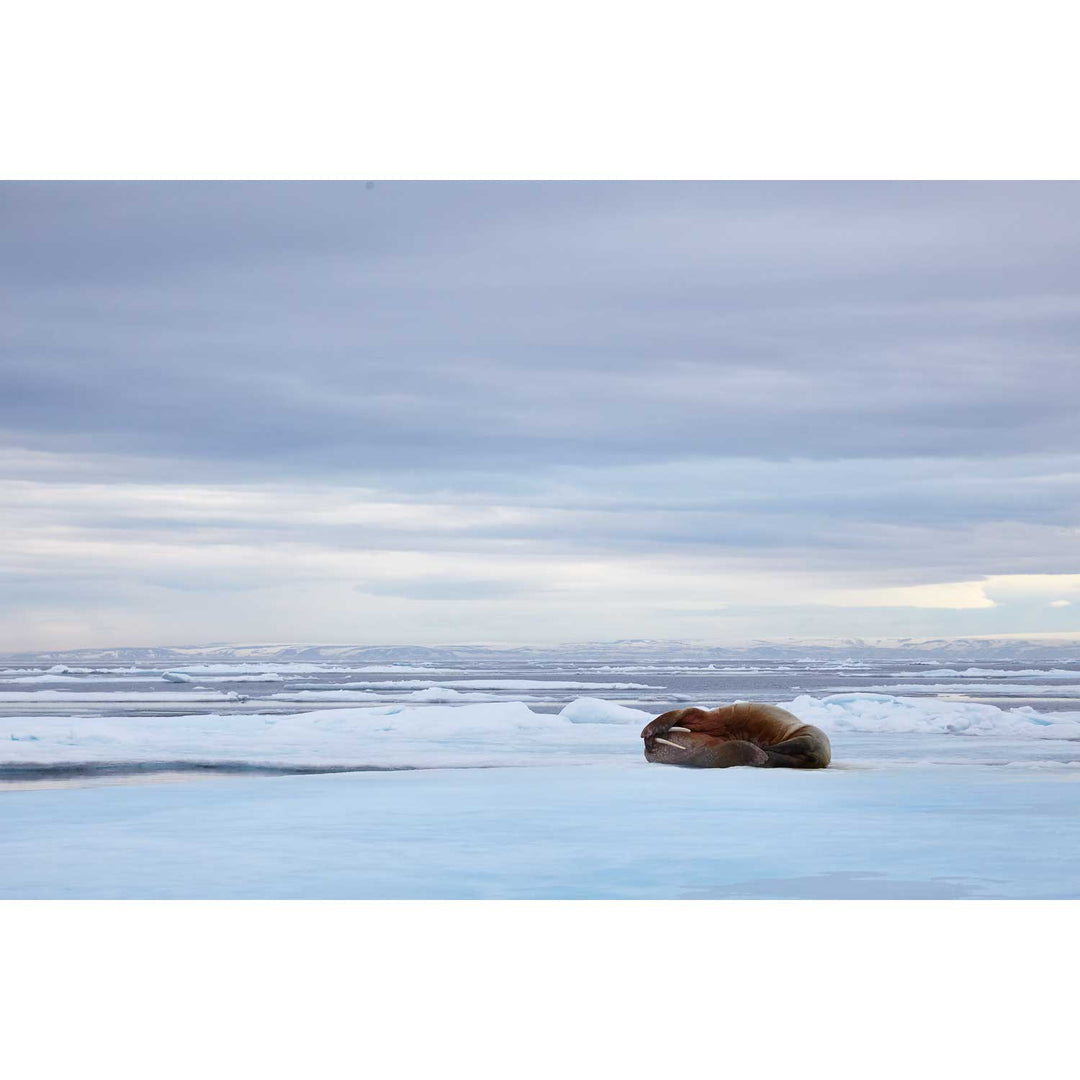 The photograph captures the serene yet harsh reality of life in the Arctic, north of Svalbard. The expansive ice floes create a striking backdrop, illustrating the untouched beauty of this remote region. The walrus, though appearing at ease, is part of a delicate ecosystem facing numerous challenges.