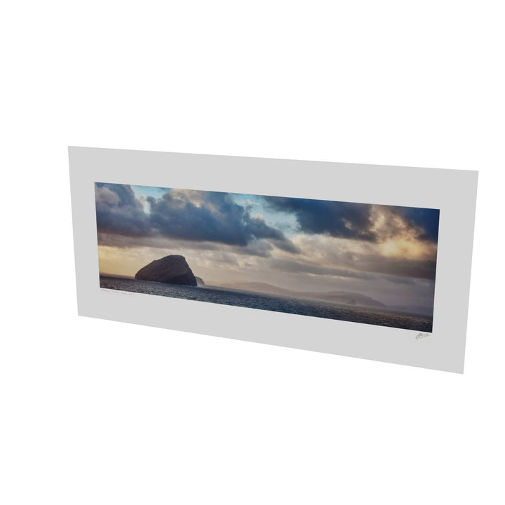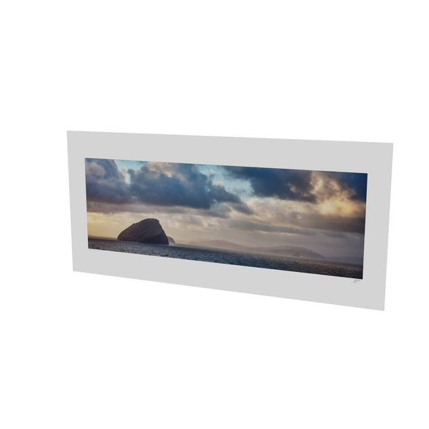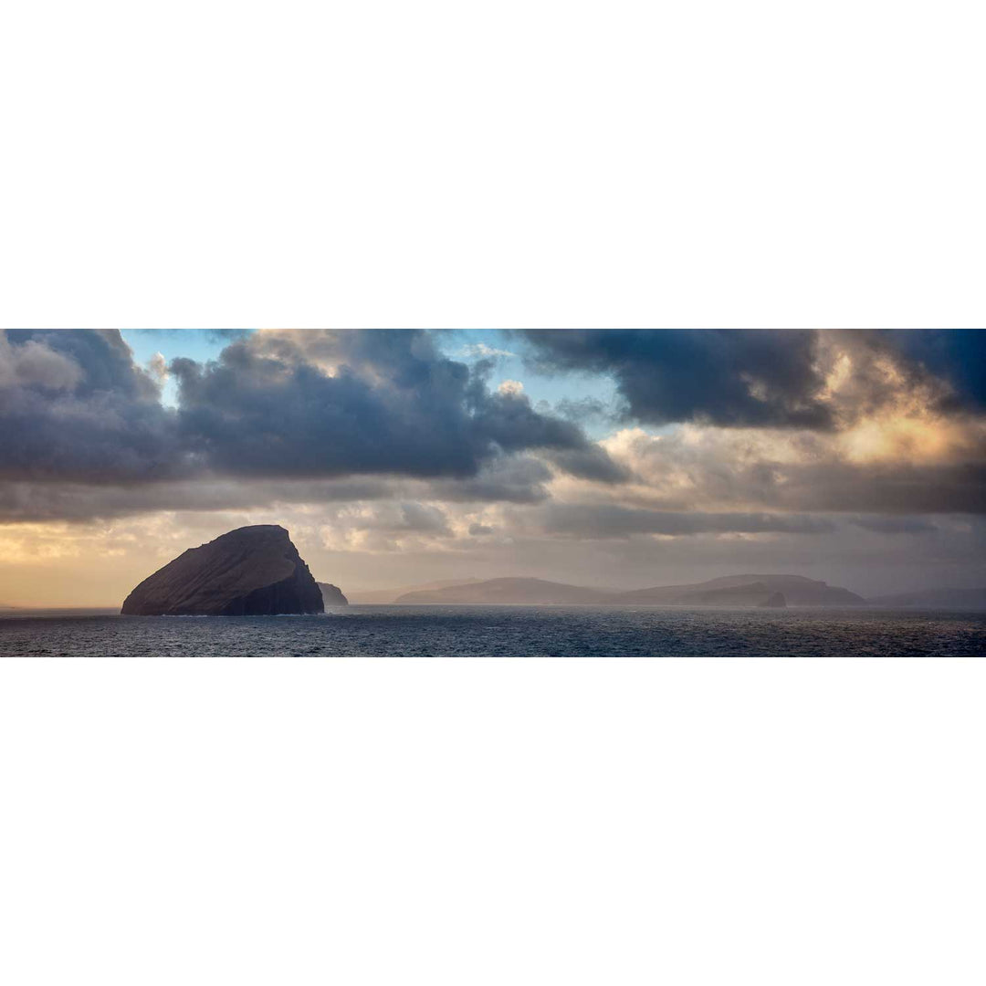 In this striking panoramic view, the uninhabited island of Koltur emerges dramatically from the sea, framed by ragged clouds that scud across the sky. The interplay of light and shadow creates a dynamic atmosphere, highlighting the island's rugged beauty. Envision this captivating scene adorning your wall, inviting contemplation and a sense of wonder.