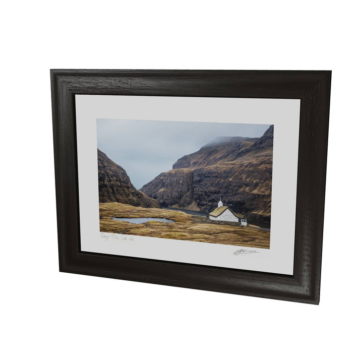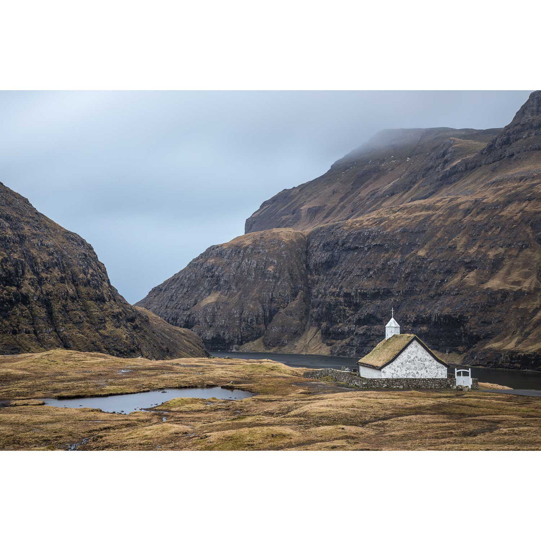 Nestled within a dramatic landscape, the quaint church with its grass-covered roof stands as a testament to traditional Faroese architecture. Surrounded by towering cliffs and a tranquil lagoon, this scene captures the rugged beauty and solitude of the valley. Imagine this striking contrast of nature and tradition on your wall, offering a window into a serene and untouched world.