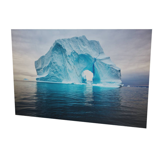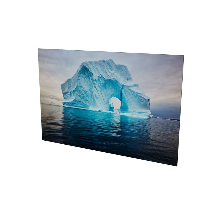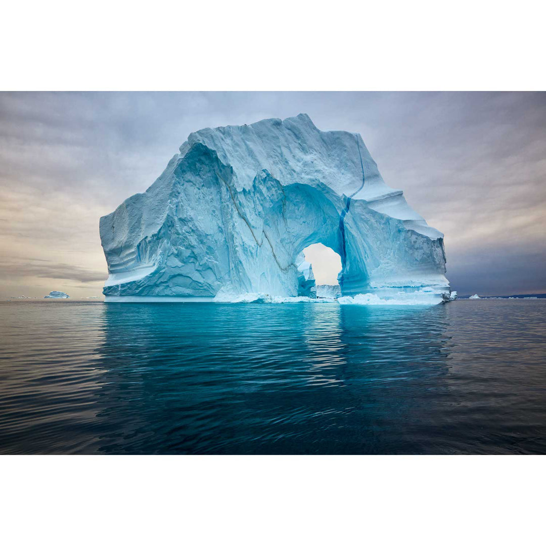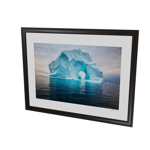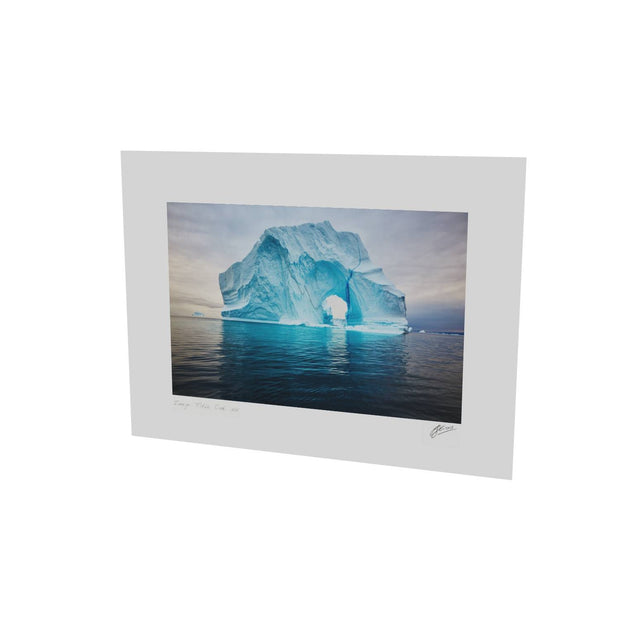 The formidable presence of this iceberg captures the serene beauty of Greenland’s icy landscape. Its majestic arch frames the distant horizon, while the deep blues and whites of the ice create an almost sculptural effect against the calm waters of the Scoresby Sound fjord system. Imagine this stunning print bringing a sense of tranquility and awe to your living space, a daily reminder of nature's astonishing artistry.