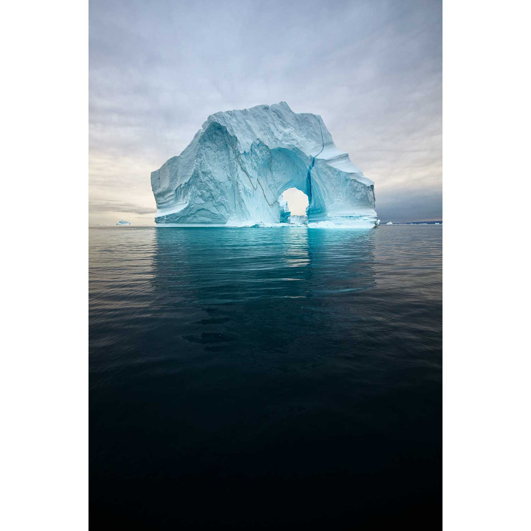 The image captures a striking iceberg, majestically floating in the still waters under a soft, muted sky. The intricate grooves and arches carved into the iceberg's surface create a mesmerizing play of shadows and light, inviting the viewer into a tranquil yet powerful moment in nature. This is the kind of artwork that transforms a room, offering viewers a glimpse into the serene beauty of distant, untouched landscapes.
