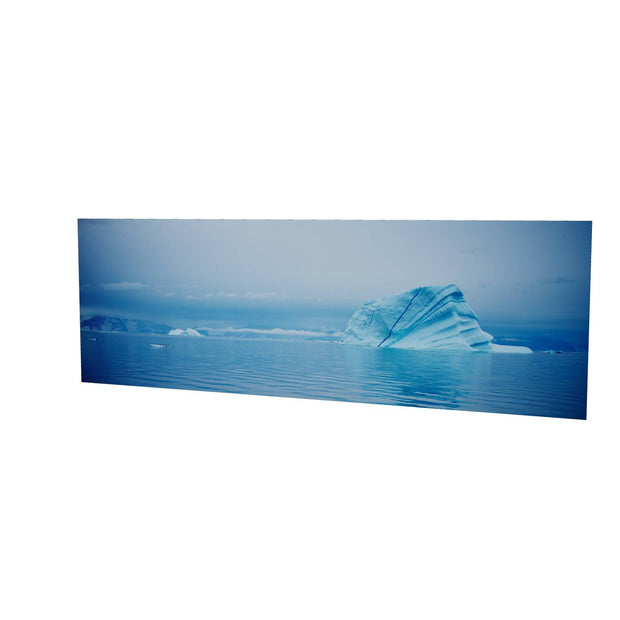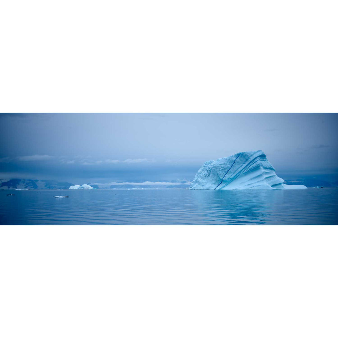 In this stunning photograph of Eastern Greenland, an iceberg takes center stage amid an expansive blue panorama. The iceberg is adorned with striking veins of blue refrozen meltwater, creating a breathtaking visual contrast against the serene sea and sky. Imagine this captivating scene adding a sense of tranquility and wonder to your living space, inviting you to explore its depths every day.