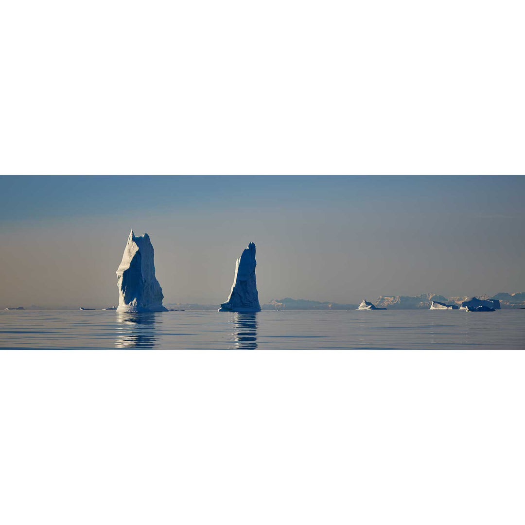 In this stunning photograph, the towering icebergs of Greenland rise majestically from the serene waters, their stark contrast against the calm sea capturing the viewer's imagination. The soft light gently caresses the icy surfaces, revealing intricate textures and shapes that speak of timelessness. This scene invites you to imagine how this majestic piece of art would enhance the ambiance of your space, adding a sense of wonder and tranquility to your wall.