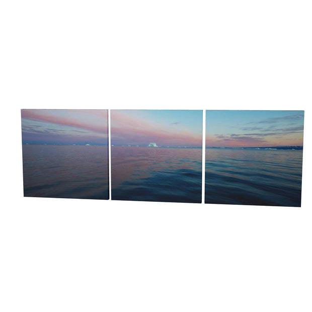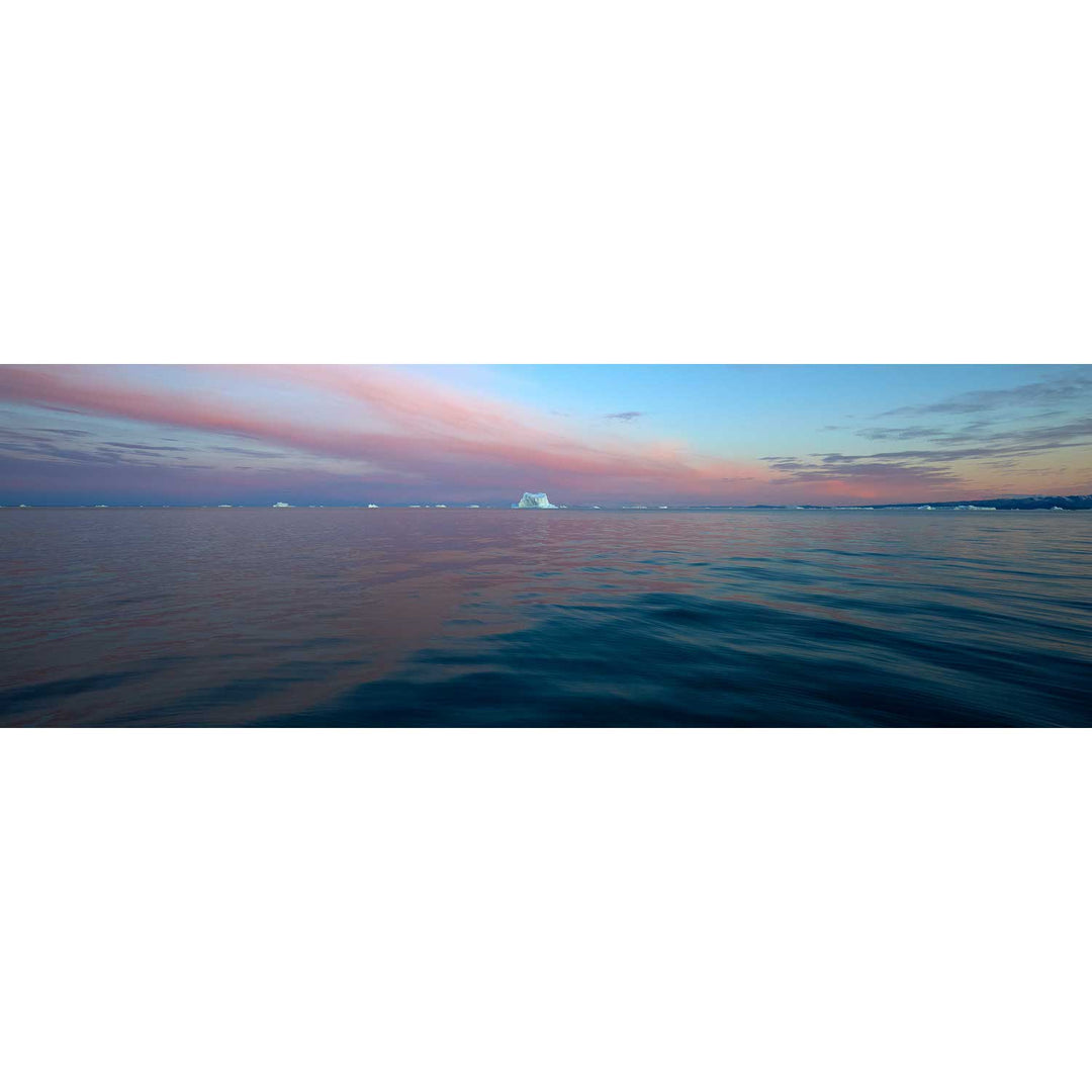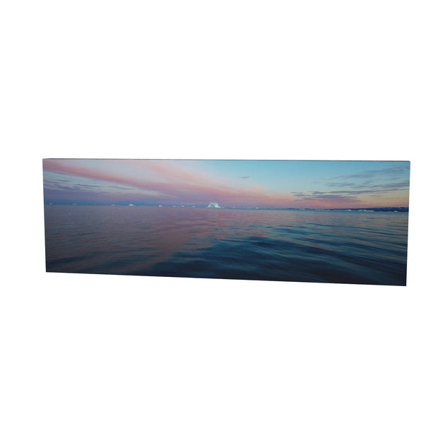 As the sun dips below the horizon, a serene palette of blue and pink stretches across the sky, perfectly mirroring the icy landscape below. Icebergs, like grand sculptures, dot the water, catching the day's last light. It's a scene that’s so breathtaking, you might find yourself tempted to hold your breath in unison with nature’s quiet performance. Imagine this print on your wall, bringing a touch of the Arctic's tranquil beauty into your home.