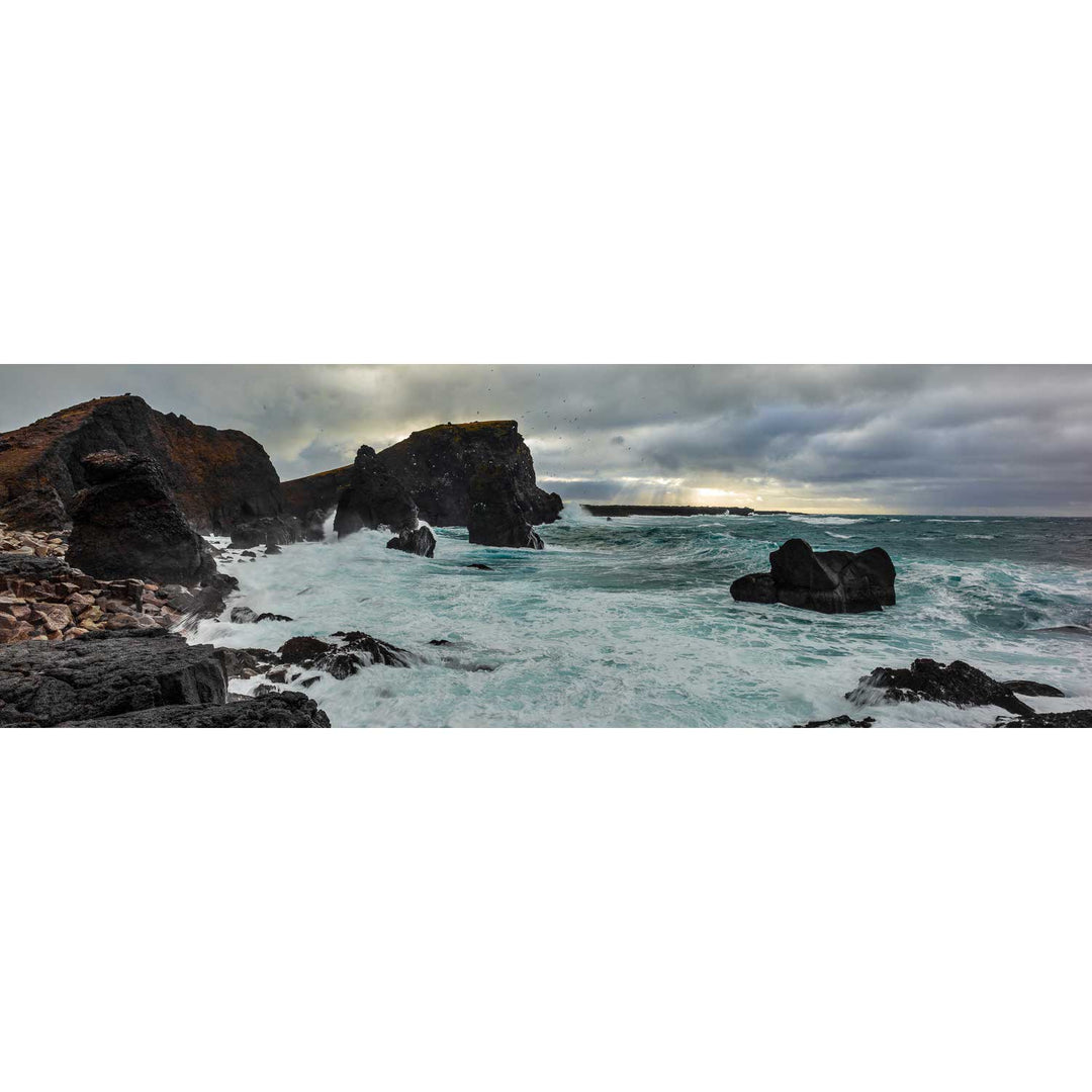 Experience the raw power and beauty of Reykjanesta's coastline in this striking landscape photograph. The fierce waves crash relentlessly against the rugged cliffs, sending sprays of seawater into the moody sky. The sea stacks stand as timeless sentinels, adding intrigue and depth to the scene. Imagine this dynamic print bringing a sense of adventure and natural elegance to your space, captivating all who lay eyes upon it.