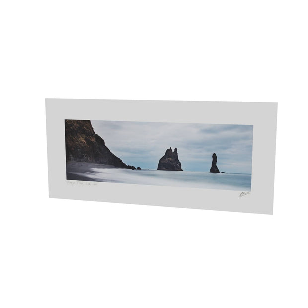 The mesmerizing sea stacks at Reynisfjara are captured against a dramatic, overcast sky, offering an ethereal view that draws the eye to the horizon. The long exposure technique softens the ocean waves, creating a serene contrast with the rugged cliffs. Imagine this striking print on your wall, bringing the allure of Icelandic landscapes into your home or office space.