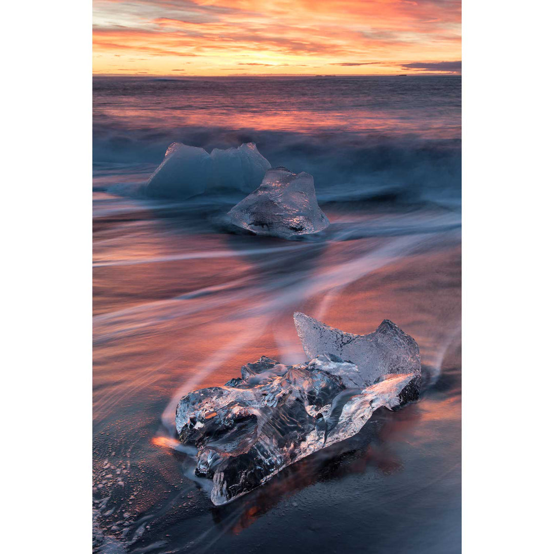 Imagine standing on a black sand beach, where the morning sun glints off crystal-clear ice chunks being gently sculpted by the rhythmic waves. The contrast between the vivid warmth of the sunrise sky and the cool, icy blues creates a mesmerizing scene. It’s as if the ocean and the sky are competing for attention, and the ice chunks are just caught in the middle of the conversation. Consider how this blend of color and contrast would bring life and movement to your wall, transforming any space with its captivating beauty.