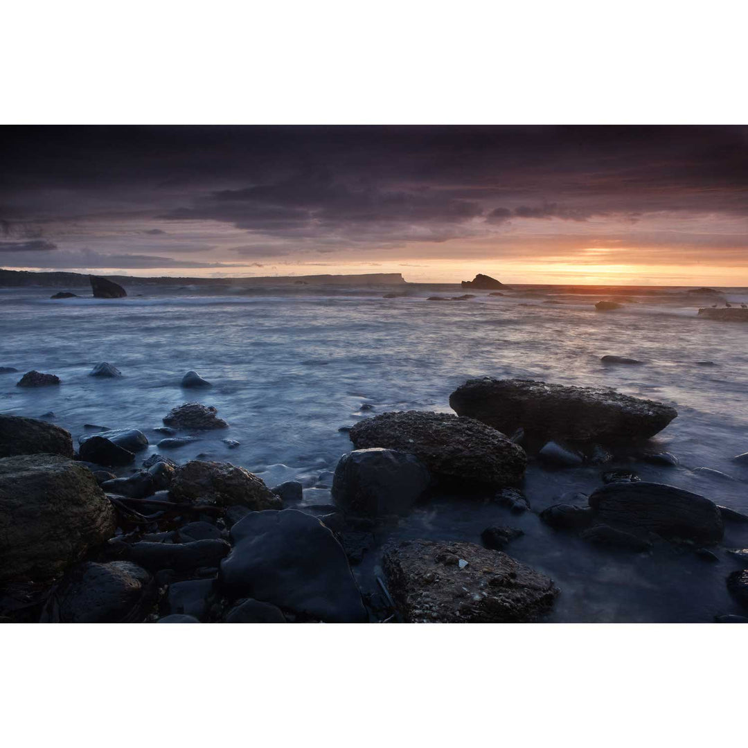 Sunset falls over Bengore Head with the sea rolling in over foreground rocks. Some birds sit on a rock in the middle distance.
