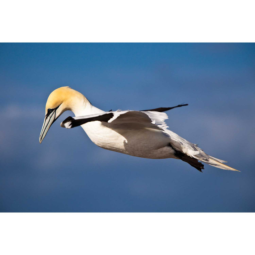 A gannet hovers in the airstream over a cliff on the Bull Rock off the coast of cork on a beautiful blustery day.