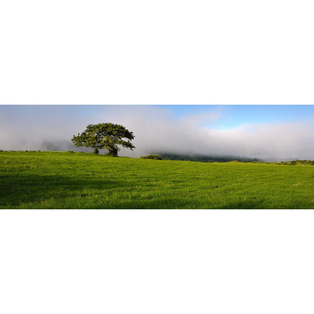 Mist descends over the mountains as a lone tree stands on a ridge above a pasture.