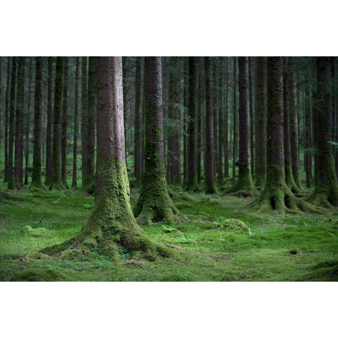 Rich light suffuses the deep woods of Gougane Barra, glancing over the moss-covered tree trunks.