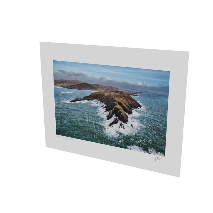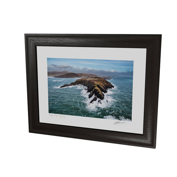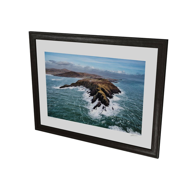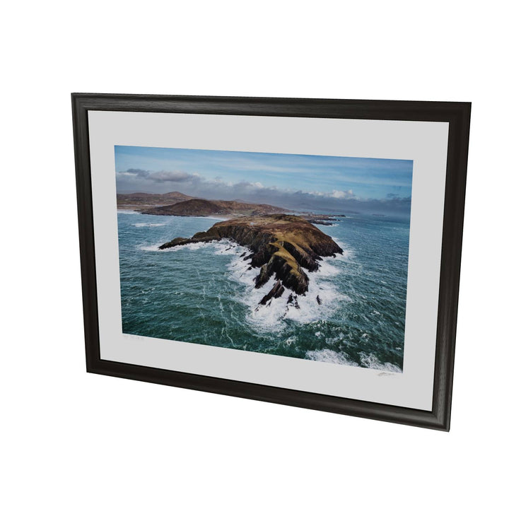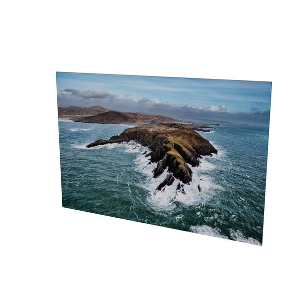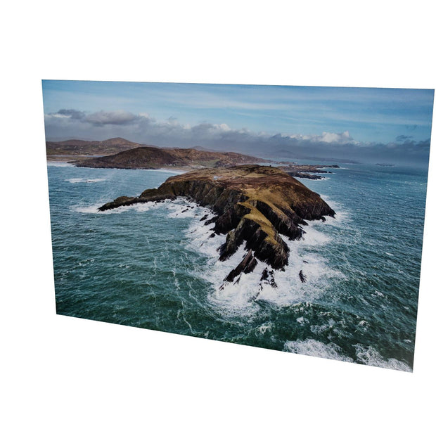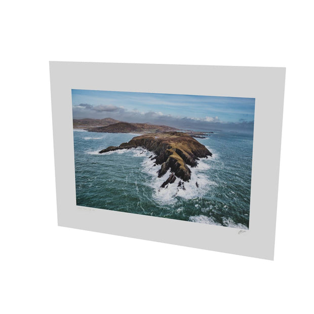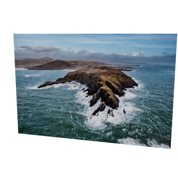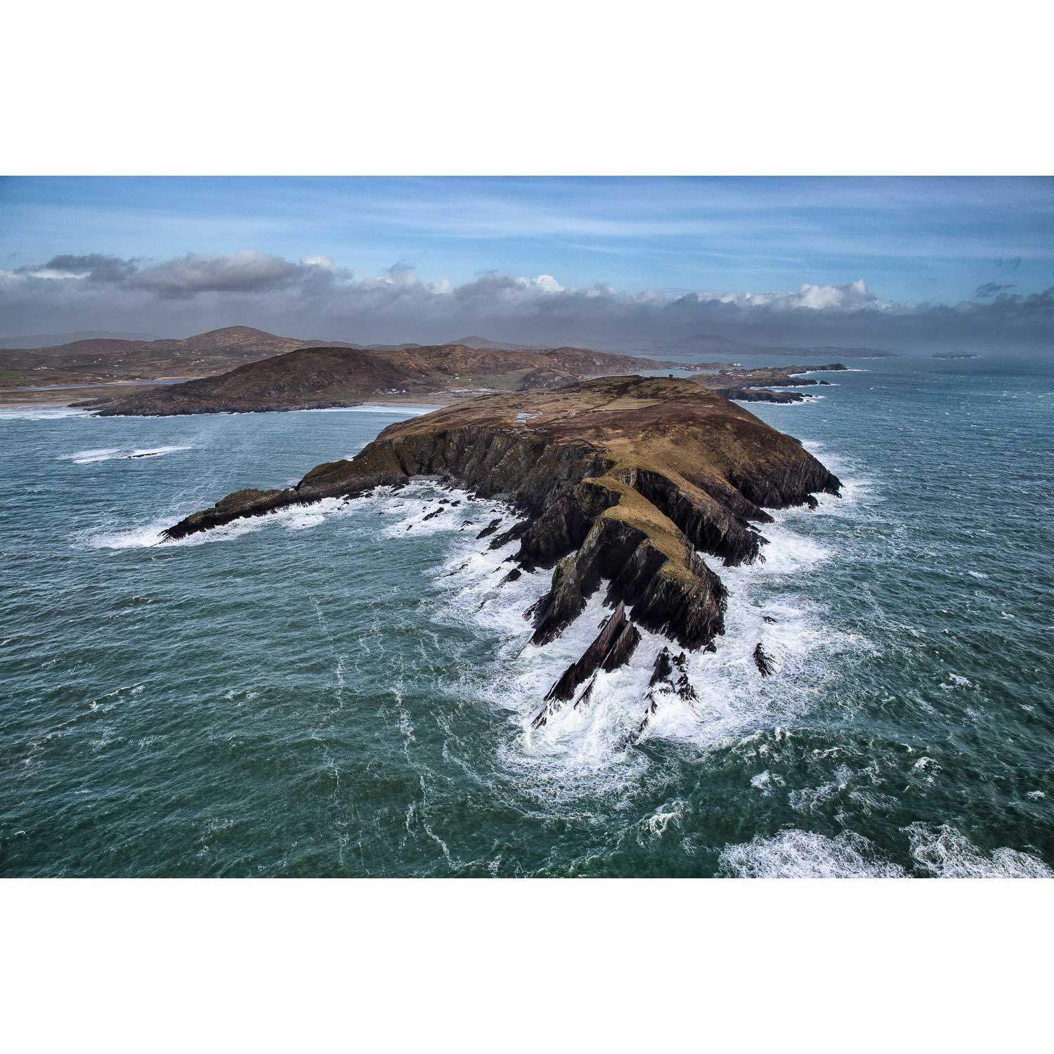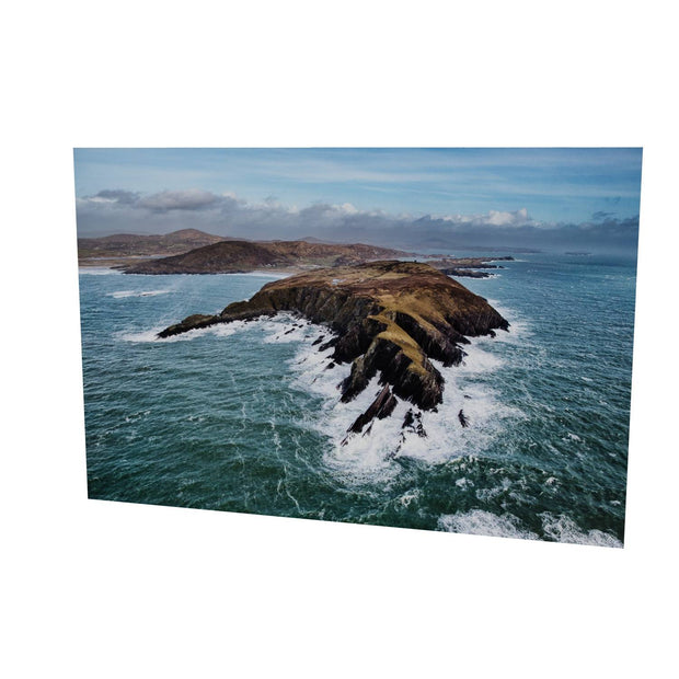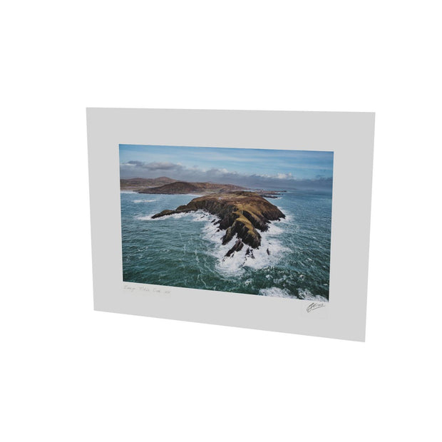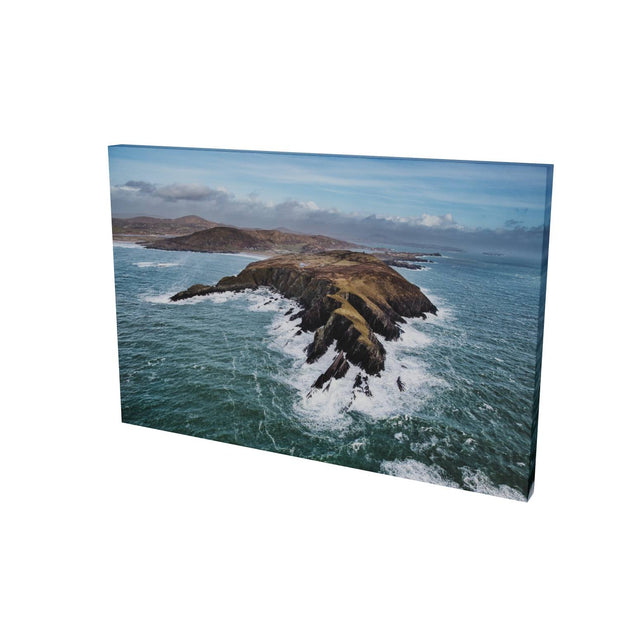 From above, this dramatic landscape is revealed in all its rugged beauty. The jagged cliffs jut into a restless sea, surrounded by swirling waters that showcase nature's raw power. It's a scene of striking contrasts, where earth meets ocean, under a vast and expansive sky. Imagine this captivating view bringing a touch of wild elegance to your space, inviting contemplation and admiration.
