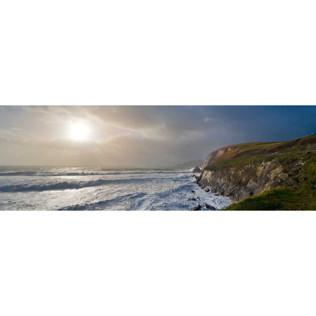 Captured in the midst of a storm, the photograph exudes raw energy as the jagged rocks of Slea Head jut defiantly against the mighty Atlantic waves. The sun fights through the clouds, casting a dramatic glow over the turbulent sea, while the foreground is alive with the textures of sea and rock. Imagine this striking scene gracing your wall, bringing a sense of nature’s power into your space.