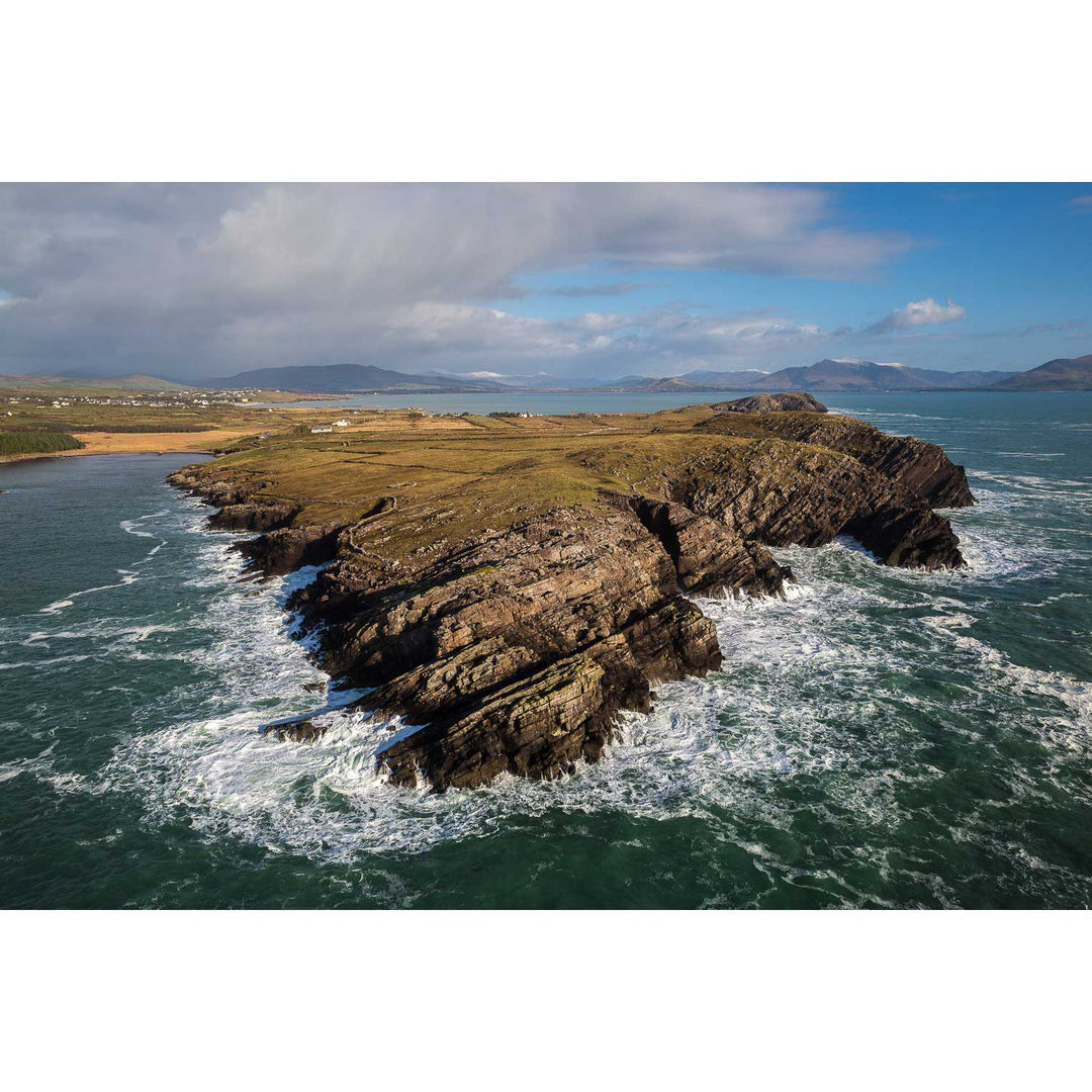 The snow-covered peaks of the Macgillycuddy’s Reeks can be seen at the top right of the image. It’s rare enough for snow to fall on the coast, but the peaks always have a dusting in the wintertime.