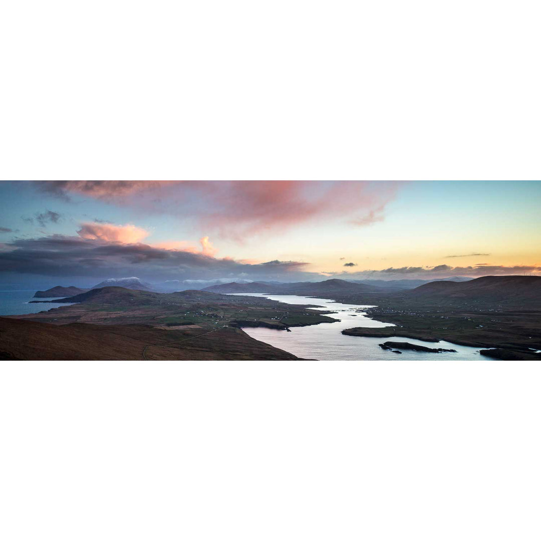 In the distance, the snow-capped peaks of the Macgillycuddy’s Reeks, Ireland’s highest mountain range, huddle together beneath a squall.