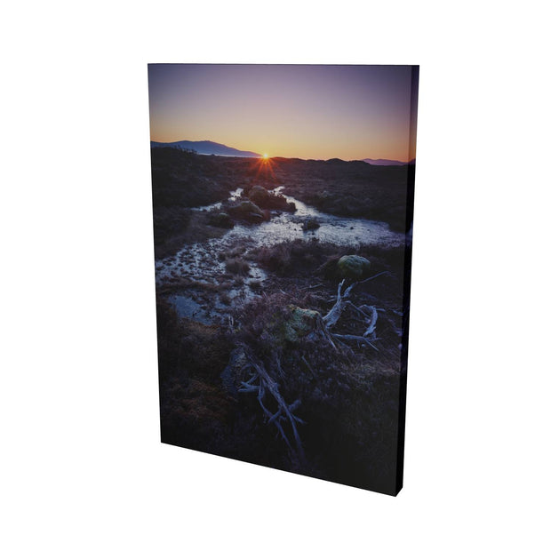 The sun peeks over the horizon, casting a warm glow over the wintry landscape of Rannoch Moor. The untouched frost on the ground captures the early light, creating intricate patterns that lead the eye across the moor. The combination of the blue shadows and the golden sky creates a beautiful contrast that's both soothing and invigorating. Imagine how this serene scene can transform the atmosphere of your living space, inviting a piece of Scottish wilderness into your home.