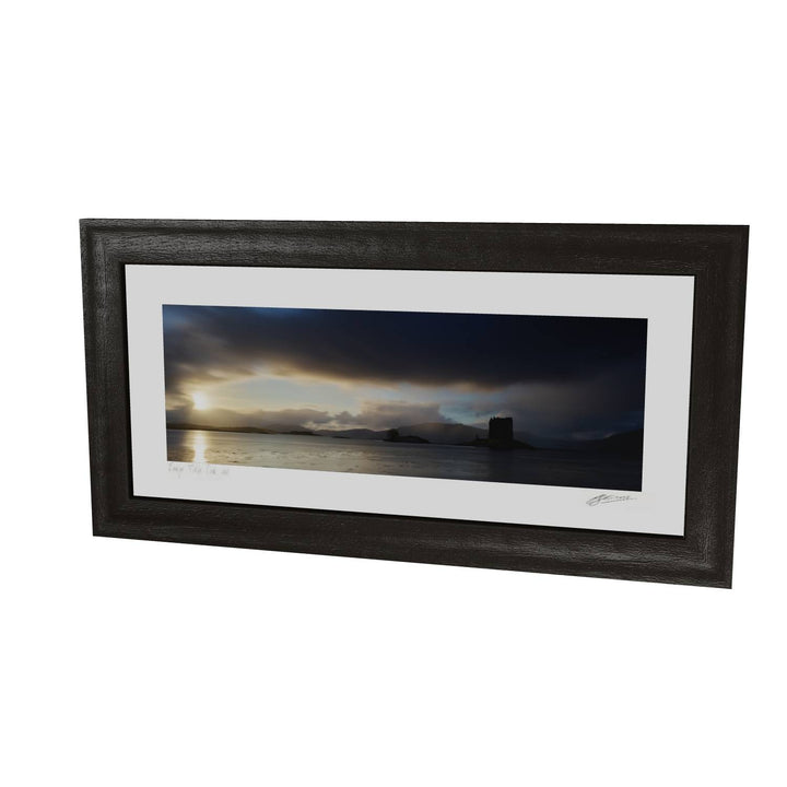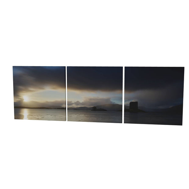 As the sun dips towards the horizon, Castle Stalker stands silhouetted against a dramatic sky, creating a captivating interplay of light and shadow. The serene waters surrounding the castle reflect the warm hues of the sunset, providing a peaceful contrast to the imposing structure. Imagine how this timeless scene would create an inviting focal point on your wall, capturing the essence of Scotland's enchanting landscapes.