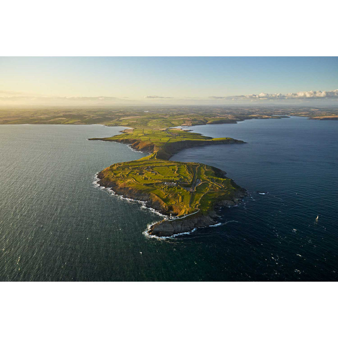 This photograph was made near sunset on a late summer's evening. The view is to the north with the golf course and lighthouse in the foreground and Kinsale town on the main coast to the right of frame. The low angle of the sun creates dramatic shadows which show the beautiful sculpting of the golf course very clearly.