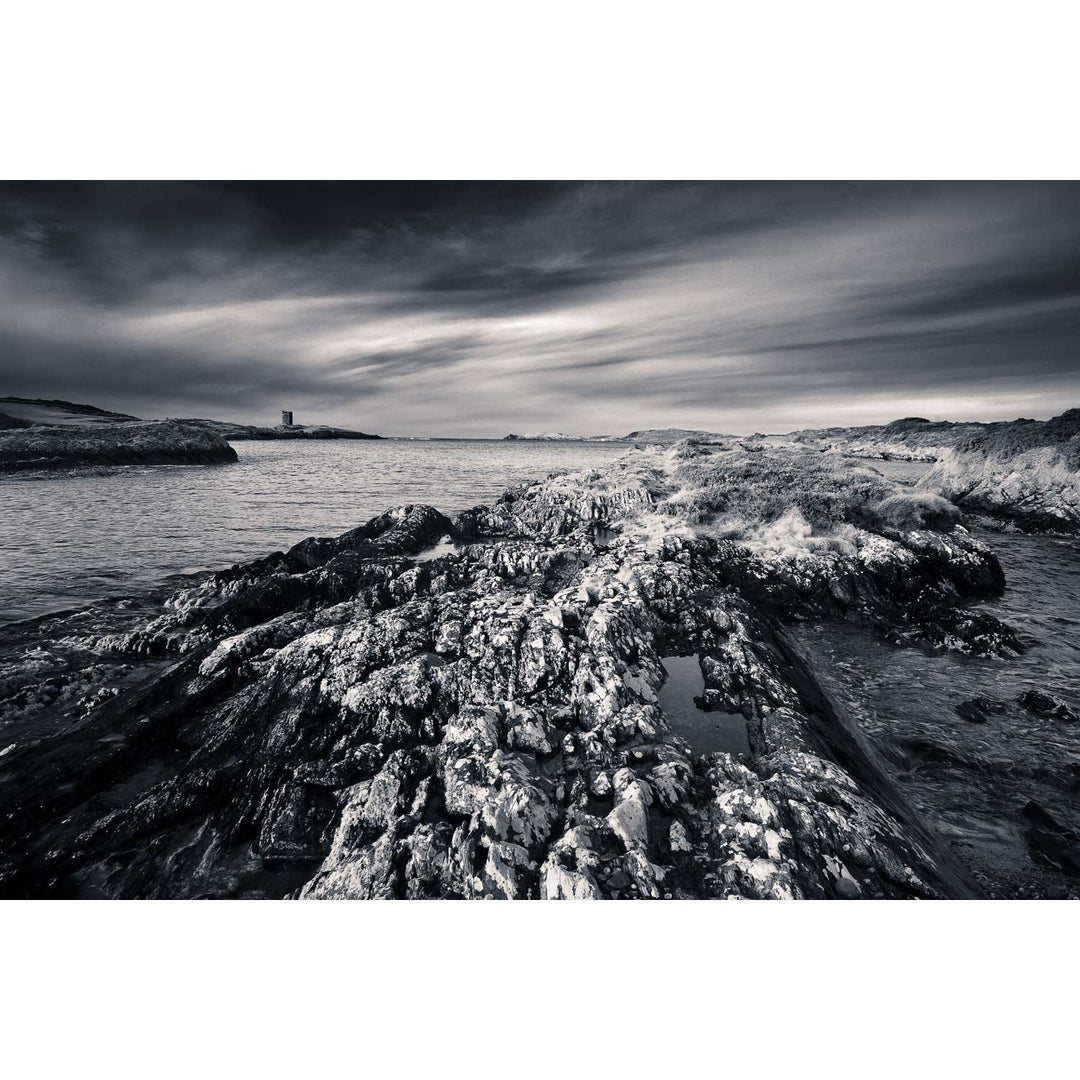The rugged coastline of the Mizen Peninsula unfolds in striking detail, with a solitary ruined watchtower standing sentinel against the vast sea. This infrared image captures the contrast between the rocky foreground and the sky, imbued with swirling clouds and a sense of timeless stillness. As you gaze upon this scene, imagine how its dramatic tones could transform your living space into a conversation starter.