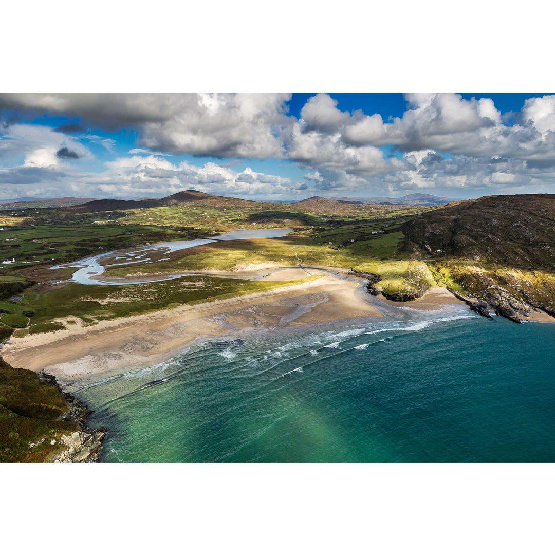 From above, the golden sands of this beach are framed by the rich blues and greens of the Atlantic Ocean and distant hills. The play of light casts fleeting shadows across the landscape, bringing out the textures and patterns of the dunes and surrounding terrain. Imagine this vibrant scene bringing a touch of Ireland’s coastal beauty to your wall.
