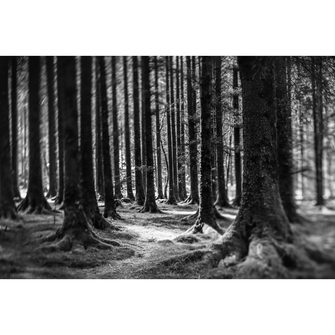 In this captivating scene, a winding path meanders through the regimented ranks of tall, straight trees. The subtle play of light and shadow enhances the intriguing contrast between the trees' rigid forms and the gentle curve of the path. In the distance, a solitary tree with a wavy trunk adds an unexpected twist, breaking the forest's symmetry. It's an enchanting view that invites you to explore deeper into its mysterious depths. Imagine how this print could bring a sense of wonder to your space.