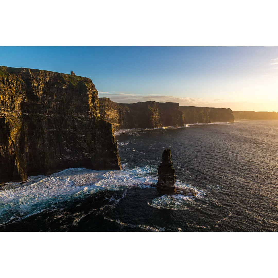 This captivating aerial view of the Cliffs of Moher offers a fresh perspective on one of Ireland's most iconic landscapes. The golden light of the setting sun casts enchanting shadows on the rugged cliffs, while the Atlantic waves playfully crash against their base. Imagine how this breathtaking scene could bring a touch of Ireland's spectacular coastline right into your living room.