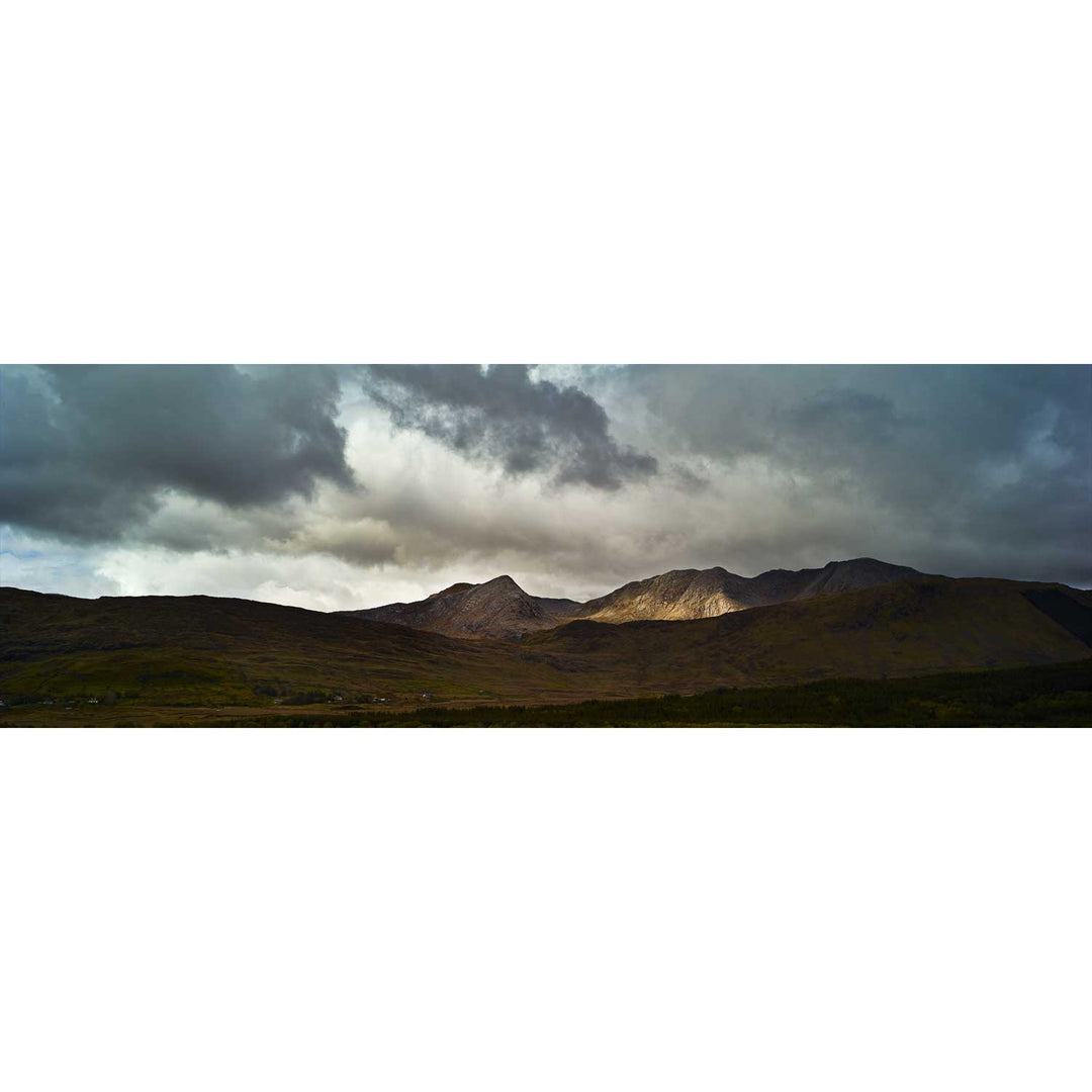 The Maumturk Mountains in Connemara lit by the sun on a stormy day.