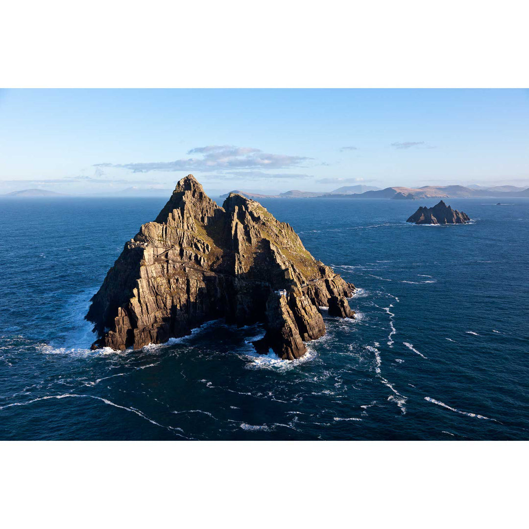 Skellig Michael (Sceilig Mhichíl) is one of the jewels of Ireland's landscape and heritage. Seen here from a helicopter, the Small Skellig and Lemon Rock are also visible. Puffin Island, Valentia and Portmagee are all visible in the distance.