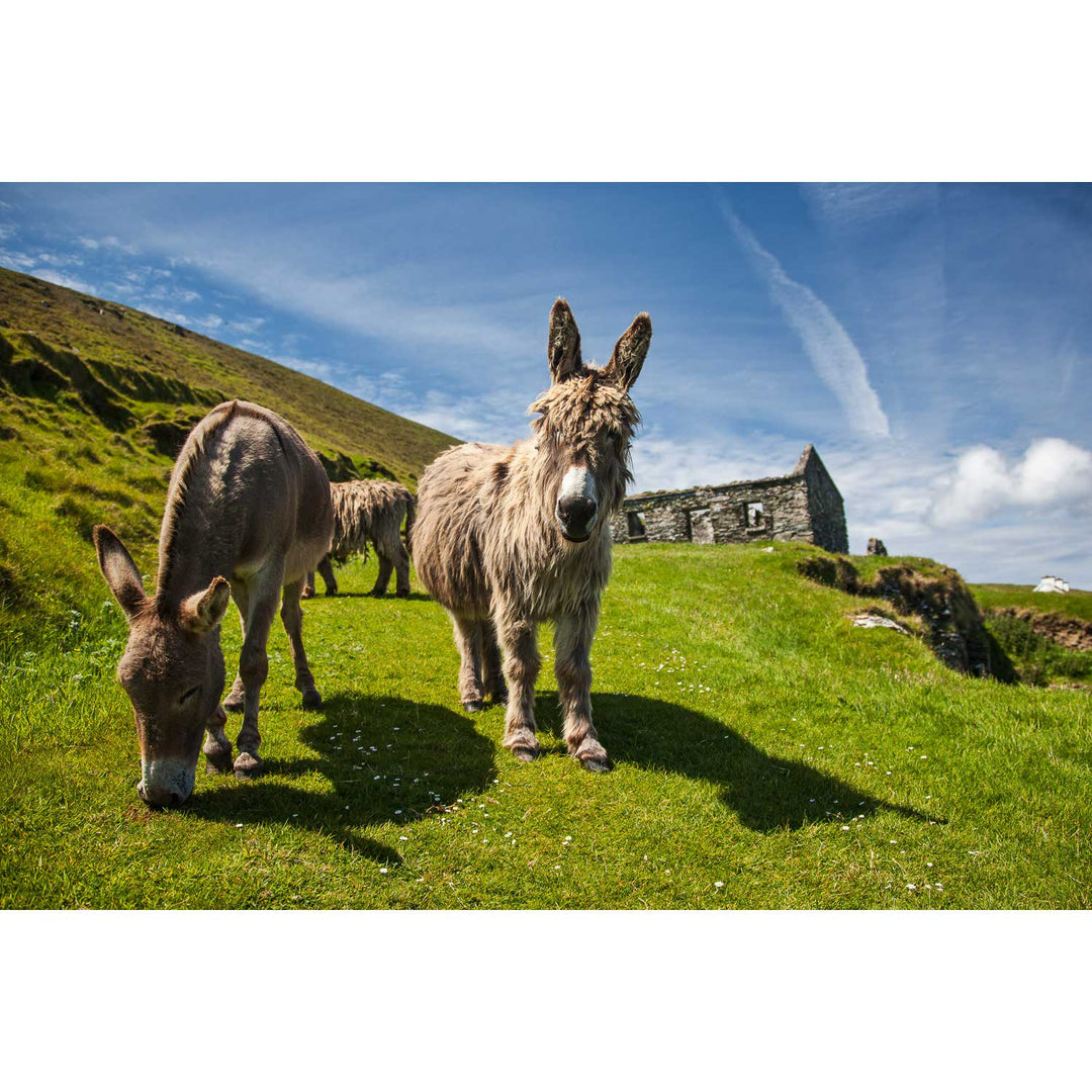In this delightful scene, a pair of donkeys take center stage against the lush, green backdrop of Great Blasket Island. Sunlight bathes the landscape, highlighting the donkeys’ gentle curiosity and the history embedded in the island's ruins in the background. The beauty and simplicity of this picture invite viewers to imagine the tranquil atmosphere and rich stories of life once bustling here. Imagine this vibrant image gracing your wall, bringing a touch of the Irish countryside into your home.