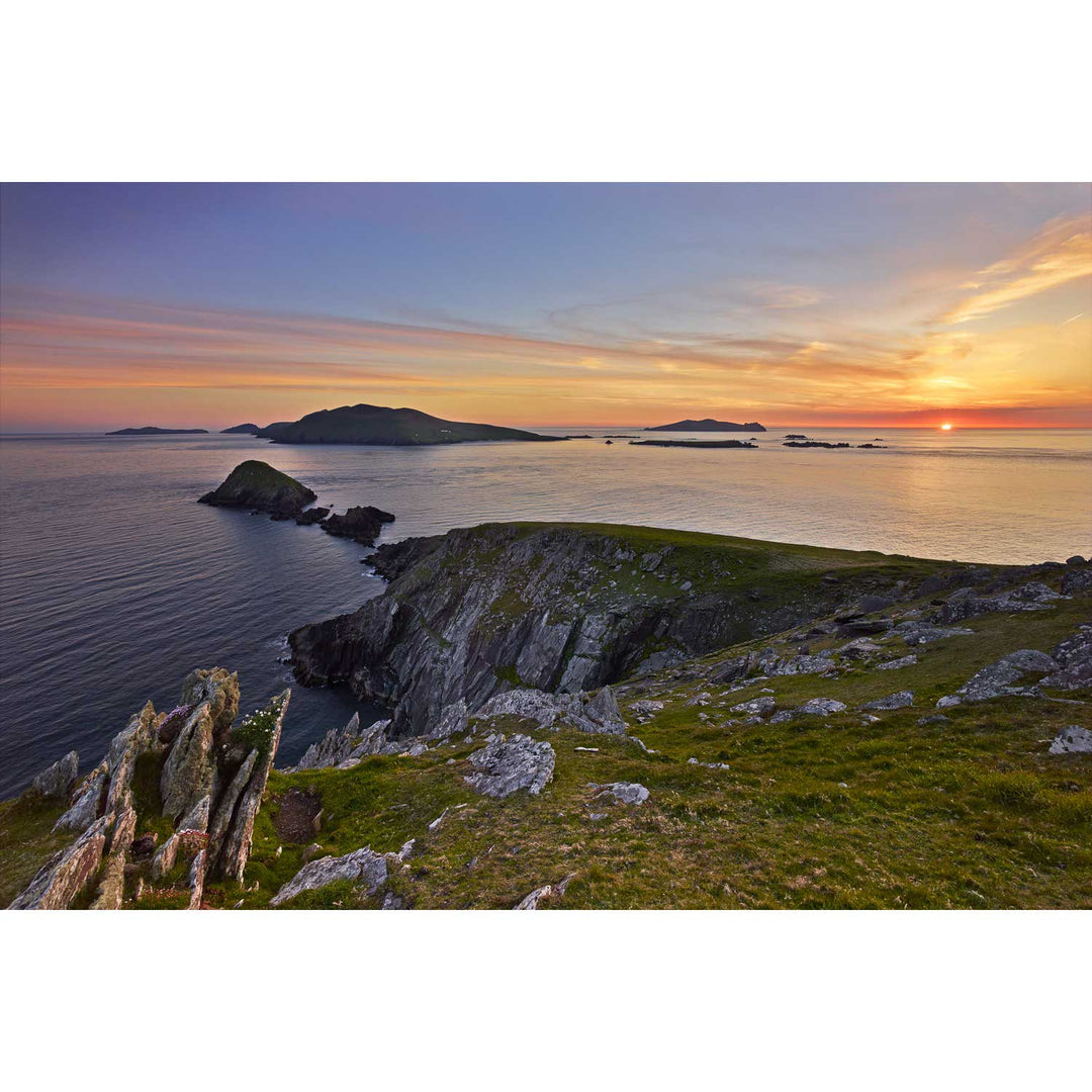 Watching the sun dip beneath the horizon, the Blasket Islands emerge as silhouettes against a vibrant sky. The gentle hues of the setting sun cast a warm glow over the tranquil waters, creating a captivating interplay of light and shadow. Imagine this serene scene bringing a touch of natural beauty into your space, evoking the calming essence of Ireland's wild landscapes.