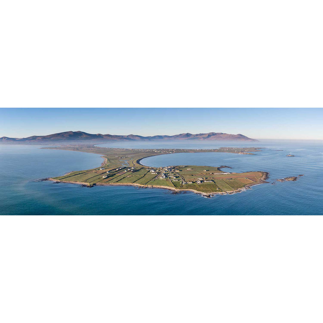 A panoramic view of the Maharees with Brandon Mountain in the early morning haze in the background.