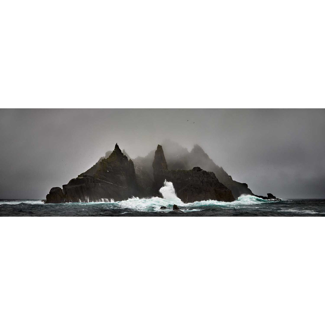 This striking photograph of the Small Skellig captures the rugged beauty of one of Ireland's most iconic offshore islands. Rising dramatically from the Atlantic Ocean, the island's jagged peaks and dark cliffs are shrouded in mist, evoking a sense of mystery and untamed wilderness. The crashing waves below and the circling seabirds above add dynamic energy to the composition, making it a perfect centerpiece for any space.