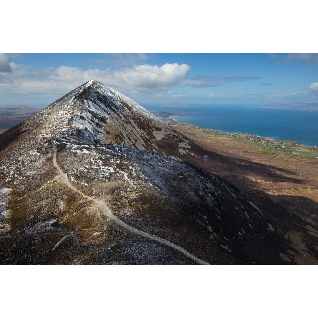 An aerial view of Croagh Patrick with Clare Island in the distance. Snow dusts the peak.