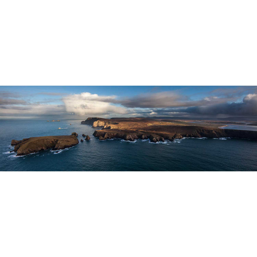 The breathtaking view captures the rugged majesty of this coastal headland. The sweeping panorama showcases the dynamic dance of light and shadow as rain squalls pass by, adding depth and drama to the scene. The composition draws the viewer in, inviting them to explore the intricate patterns and textures formed by the interplay of land and sea. Imagine this stunning piece on your wall, where it can inspire and captivate daily.