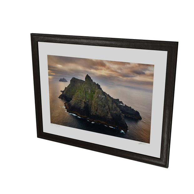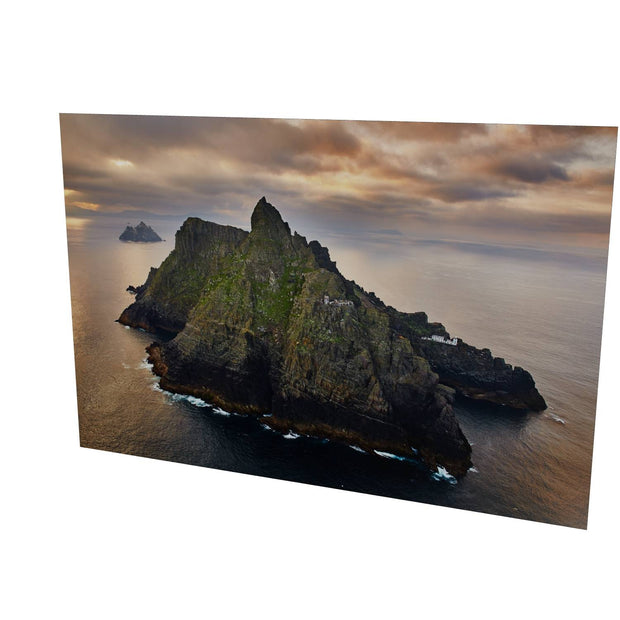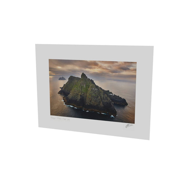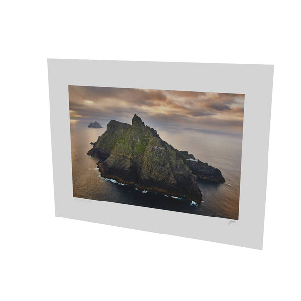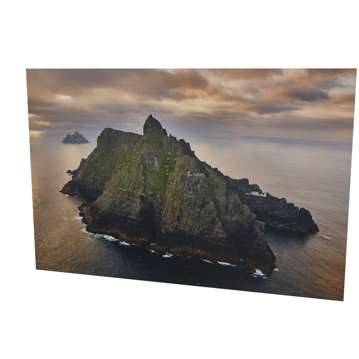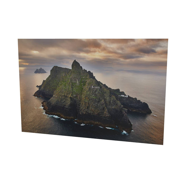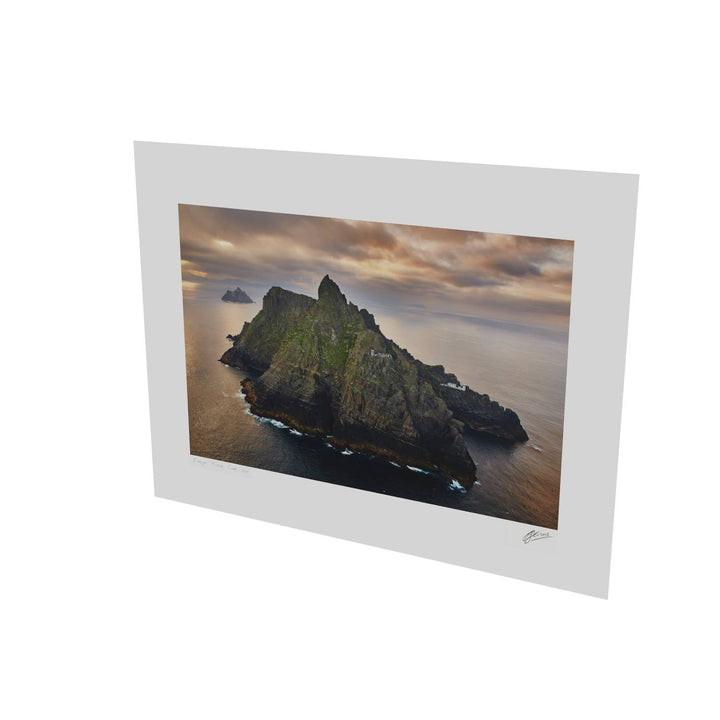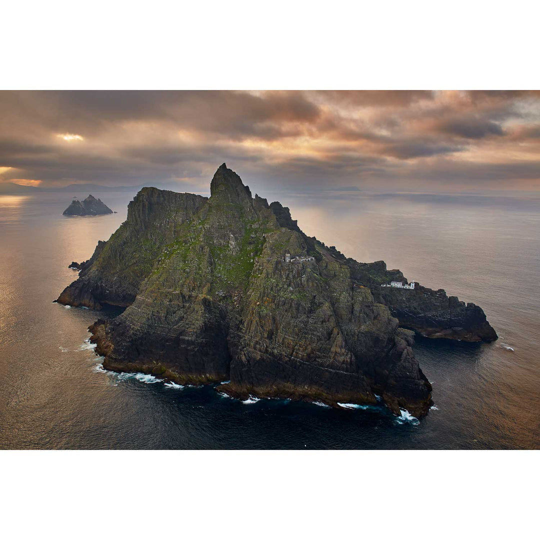 Photographed just after sunrise, this view from the western end of Skellig Michael shows the two lighthouses very effectively. As shafts of sunlight penetrate the clouds and light up the sea, the abandoned northern lighthouse sits high on its ridge in the centre of the frame. The still-operational southern light is very visible with its white painted walls.