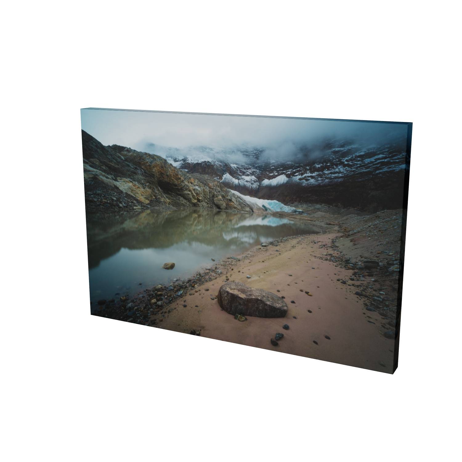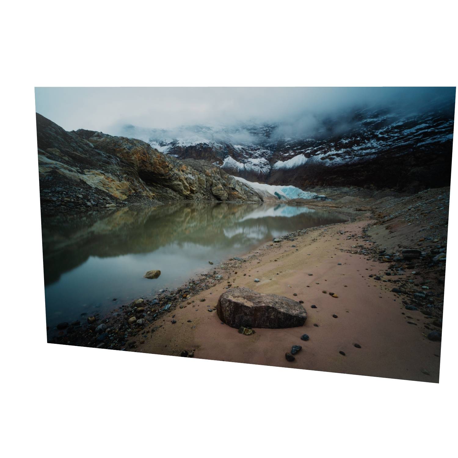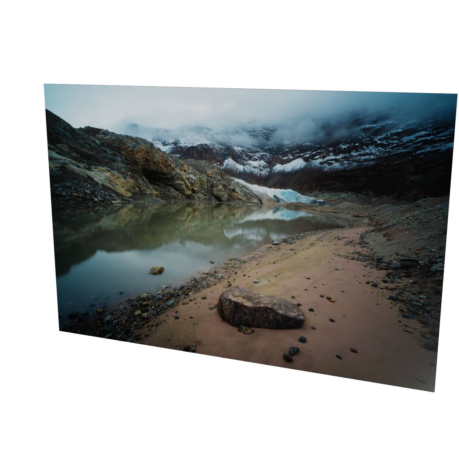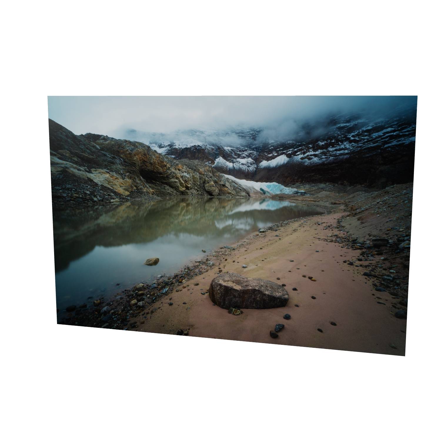 This atmospheric photograph captures the raw character of Greenland's Arctic landscape, where a glacial lake mirrors the ice-carved peaks above. Low cloud drifts through the valley, partially obscuring the glacier and mountains beyond, while the sandy shoreline and scattered stones in the foreground lead the eye toward the turquoise ice visible through the mist. The muted color palette—ochre rock, grey-blue water, and white ice—creates a sense of quiet drama that's characteristic of high-latitude environments. Captured in Scoresby Sund, the world's largest fjord system, this fine art landscape print brings the remote beauty of Greenland into your home. The composition balances geological detail with atmospheric conditions, making it an ideal choice for those seeking Arctic photography, glacial landscape art, or unique wall art that goes beyond the familiar. This photograph works particularly well in contemporary interiors where its subtle tones and sense of scale can be appreciated.