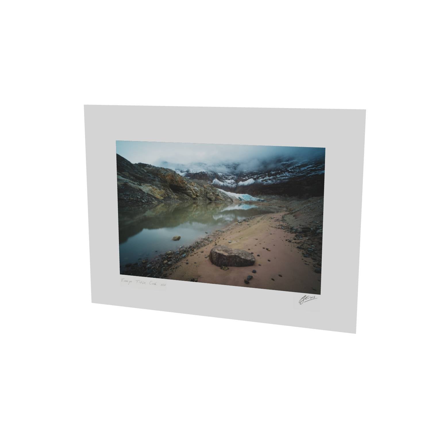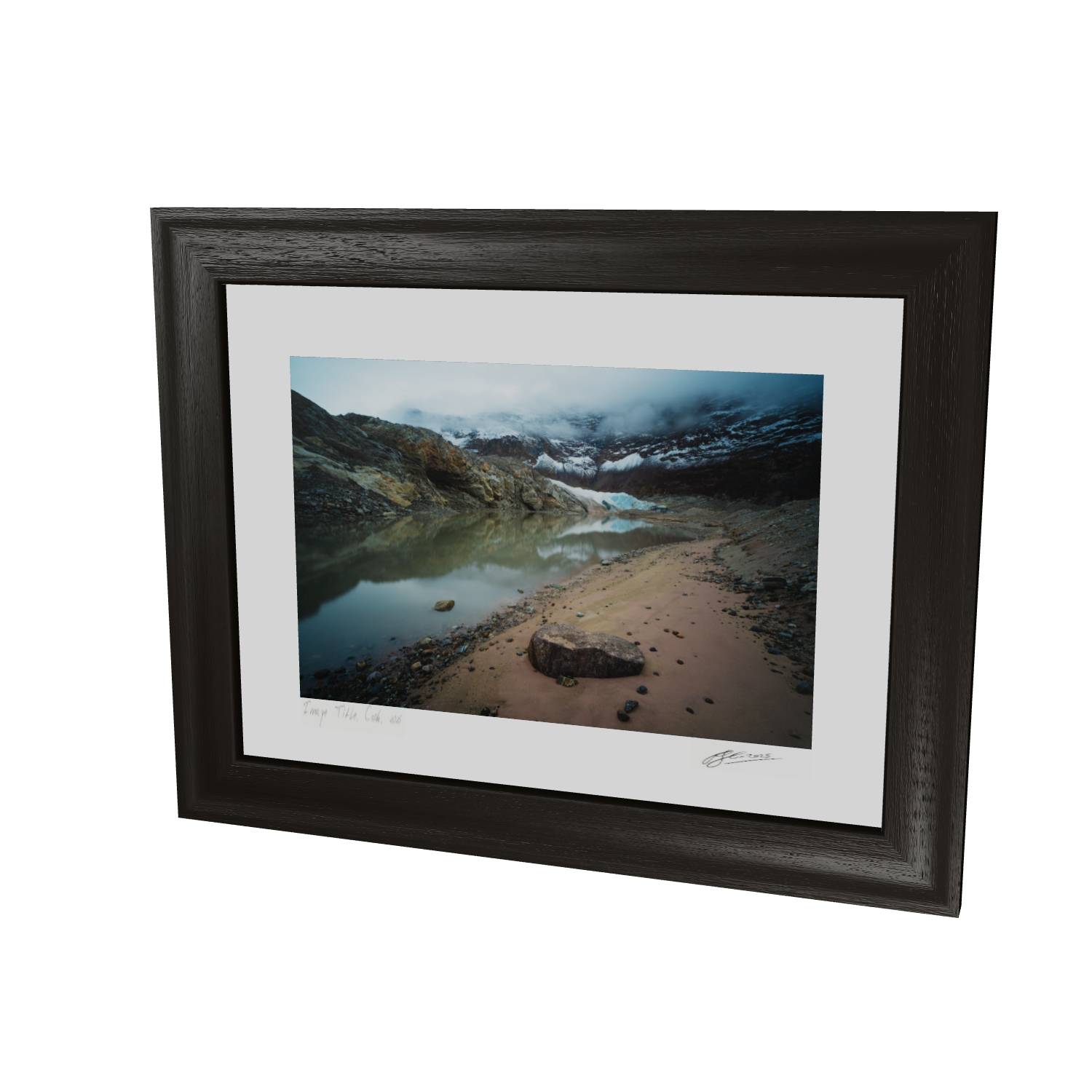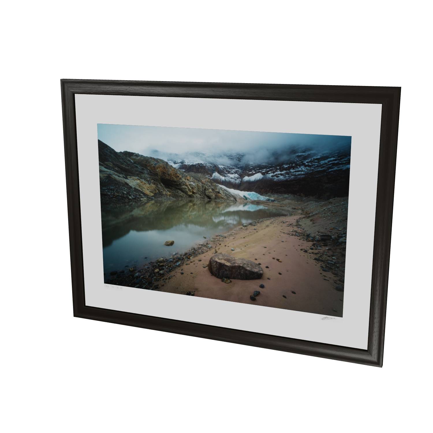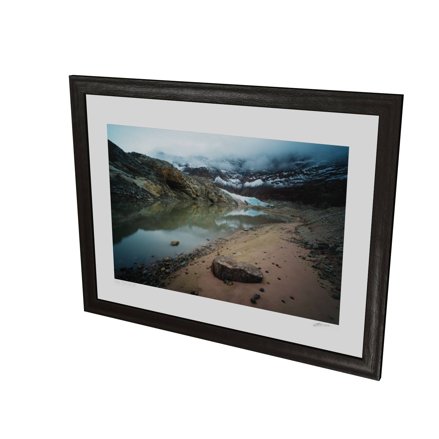 This atmospheric photograph captures the raw character of Greenland's Arctic landscape, where a glacial lake mirrors the ice-carved peaks above. Low cloud drifts through the valley, partially obscuring the glacier and mountains beyond, while the sandy shoreline and scattered stones in the foreground lead the eye toward the turquoise ice visible through the mist. The muted color palette—ochre rock, grey-blue water, and white ice—creates a sense of quiet drama that's characteristic of high-latitude environments. Captured in Scoresby Sund, the world's largest fjord system, this fine art landscape print brings the remote beauty of Greenland into your home. The composition balances geological detail with atmospheric conditions, making it an ideal choice for those seeking Arctic photography, glacial landscape art, or unique wall art that goes beyond the familiar. This photograph works particularly well in contemporary interiors where its subtle tones and sense of scale can be appreciated.