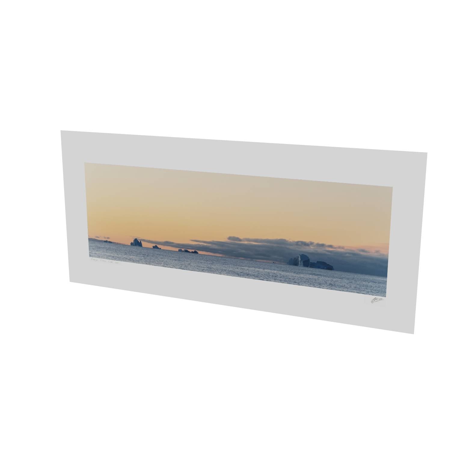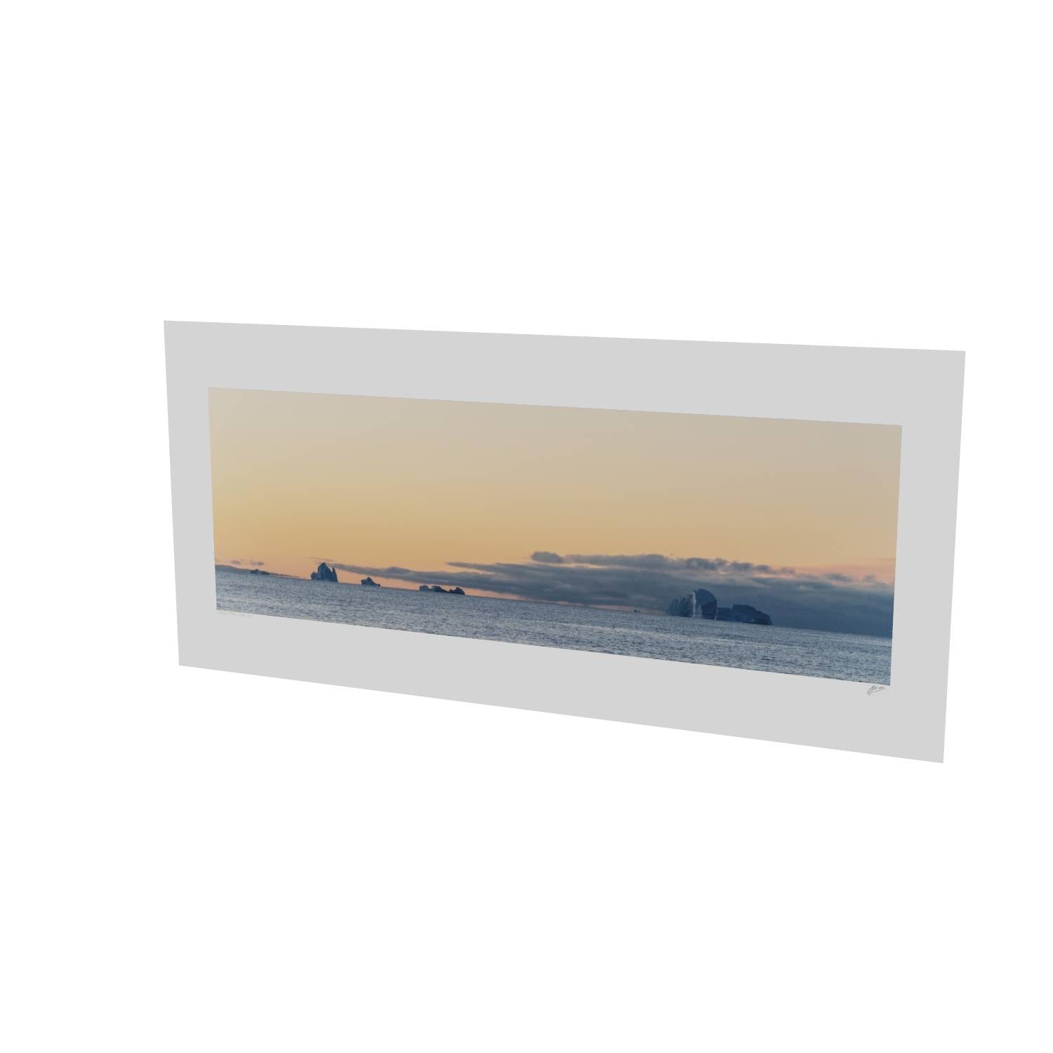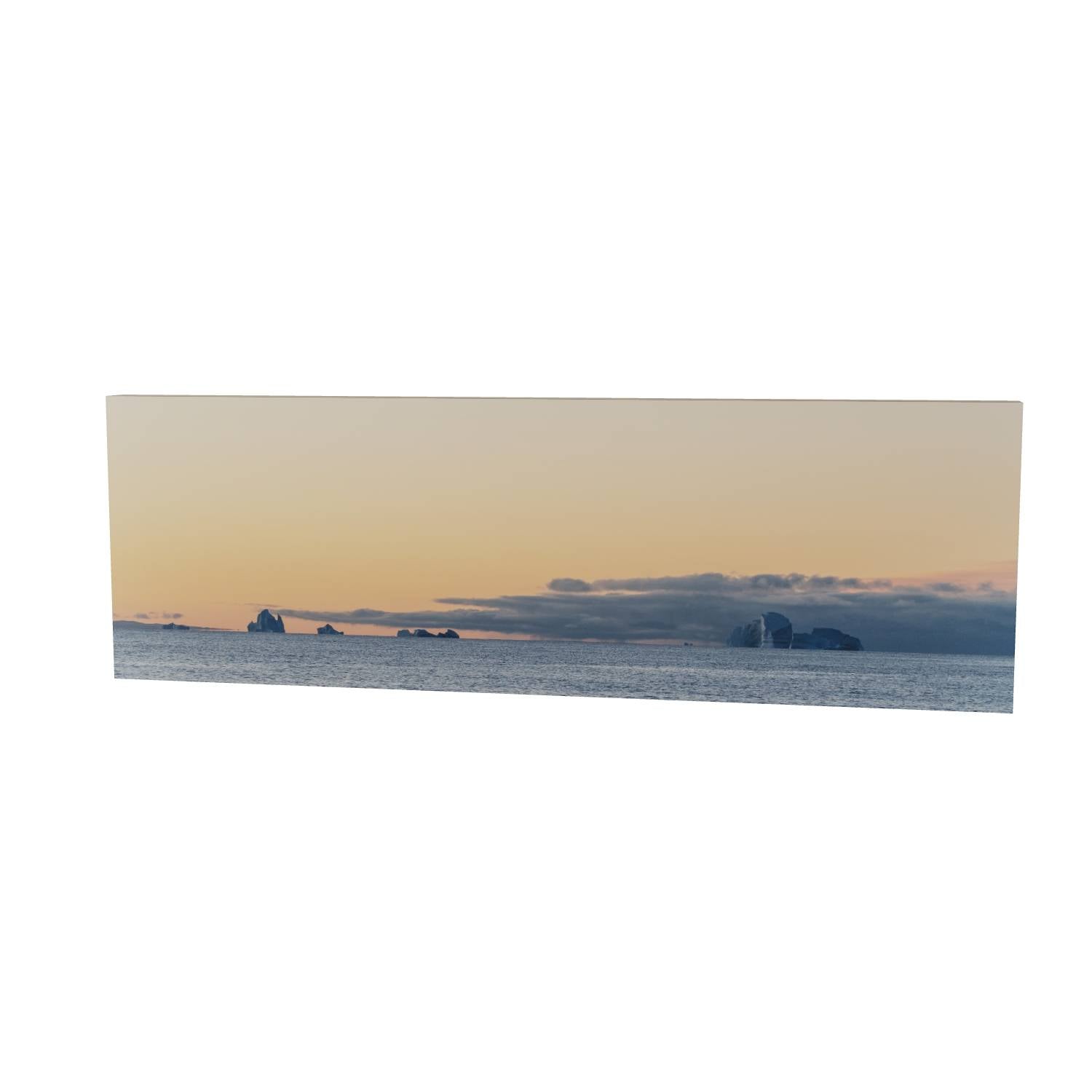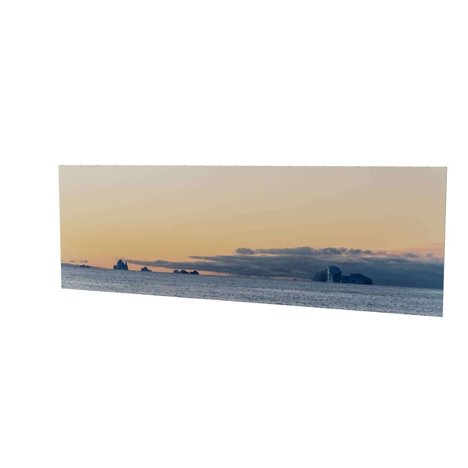 There's something quietly powerful about watching icebergs drift across a calm sea as the day fades. This image from Scoresby Sund in Greenland captures that fleeting moment when warm peach tones spread across the sky and meet the cool grey of the water below. The icebergs sit along the horizon like ancient monuments, their white forms catching the last light. The panoramic format gives this print a sense of scale that works well on a wall, drawing the eye across the scene from left to right. It's a reminder of how vast and unhurried these landscapes can be—the kind of image that brings a bit of calm to any room it hangs in.