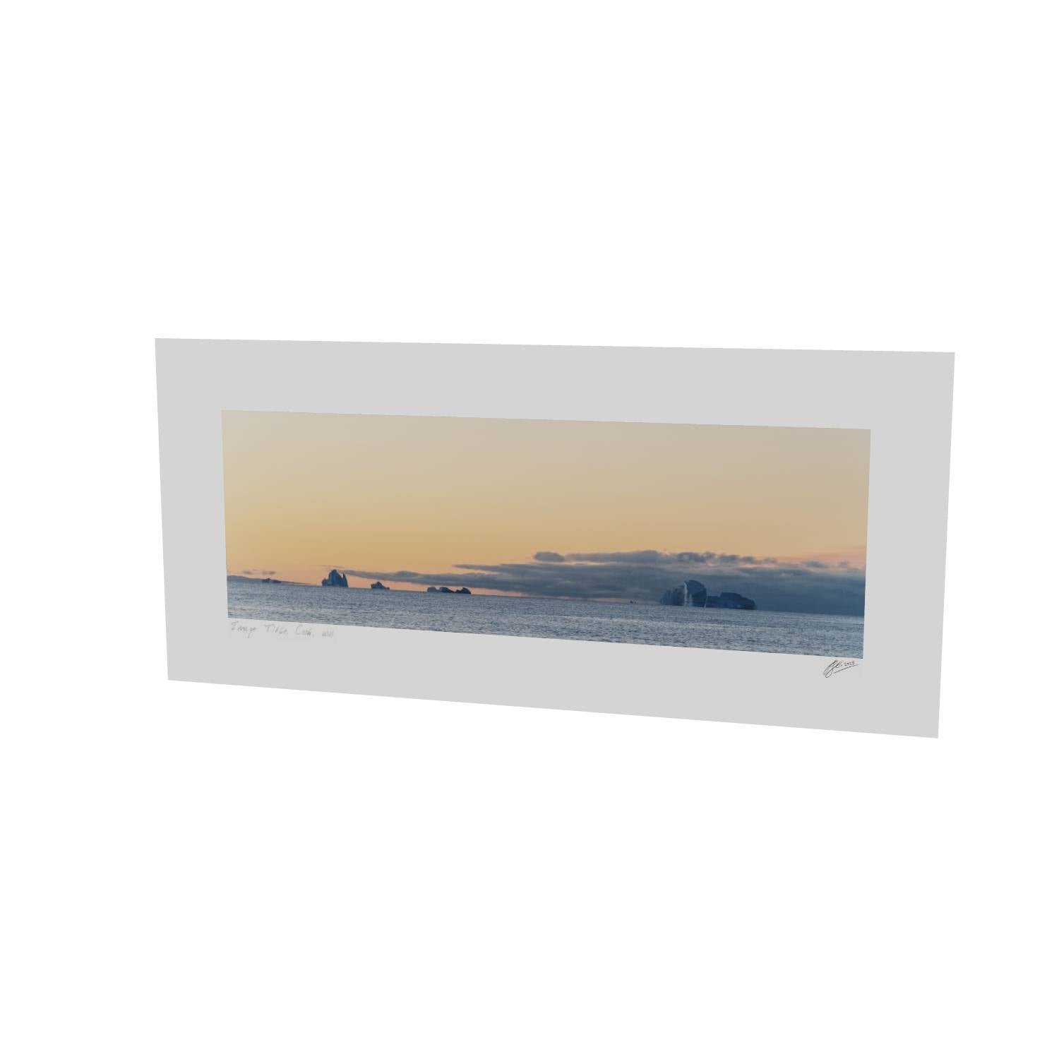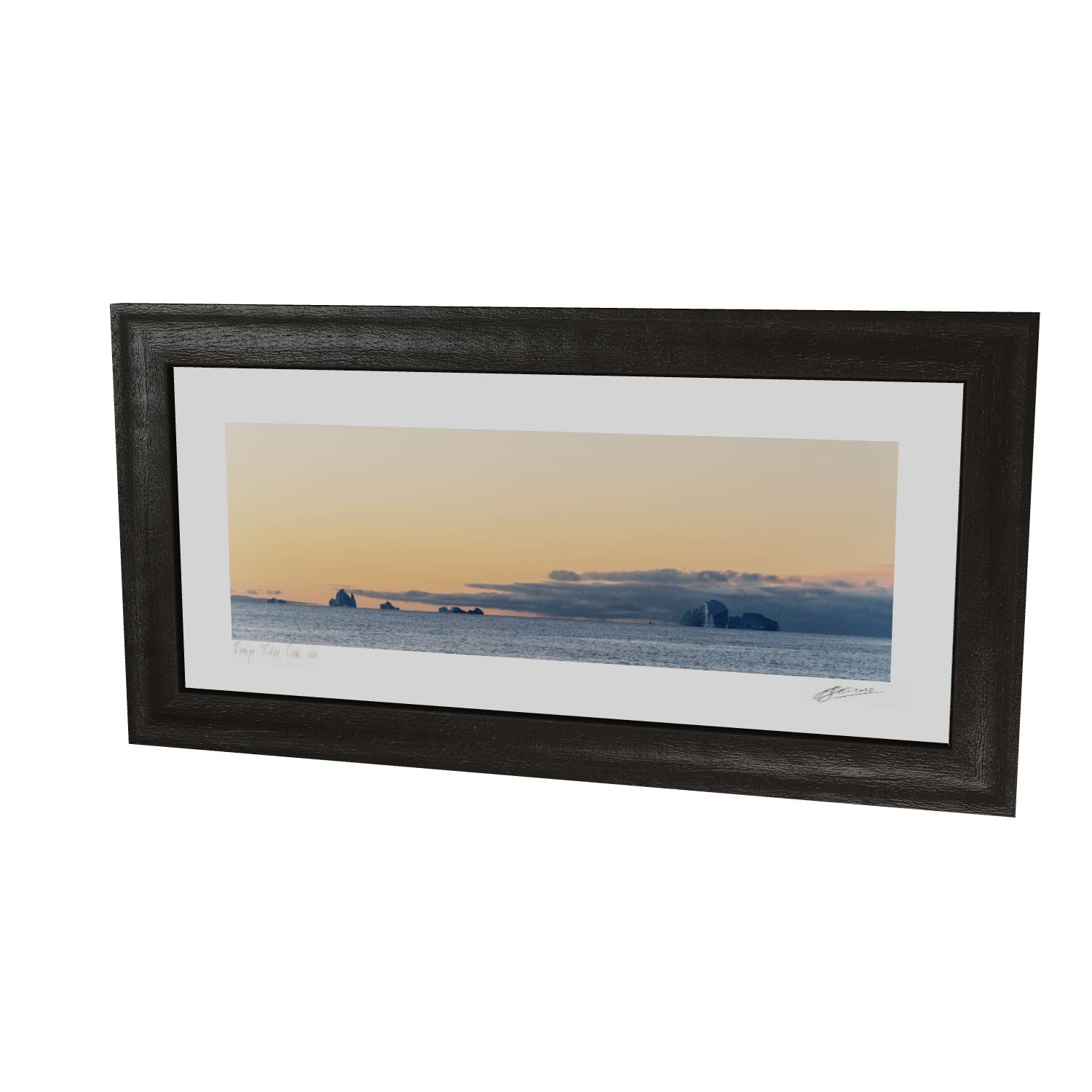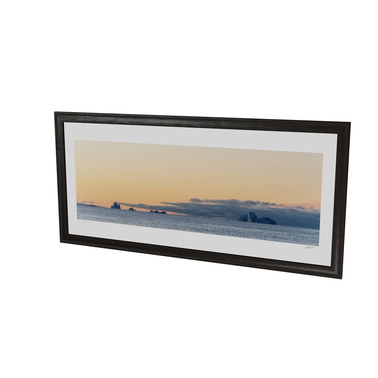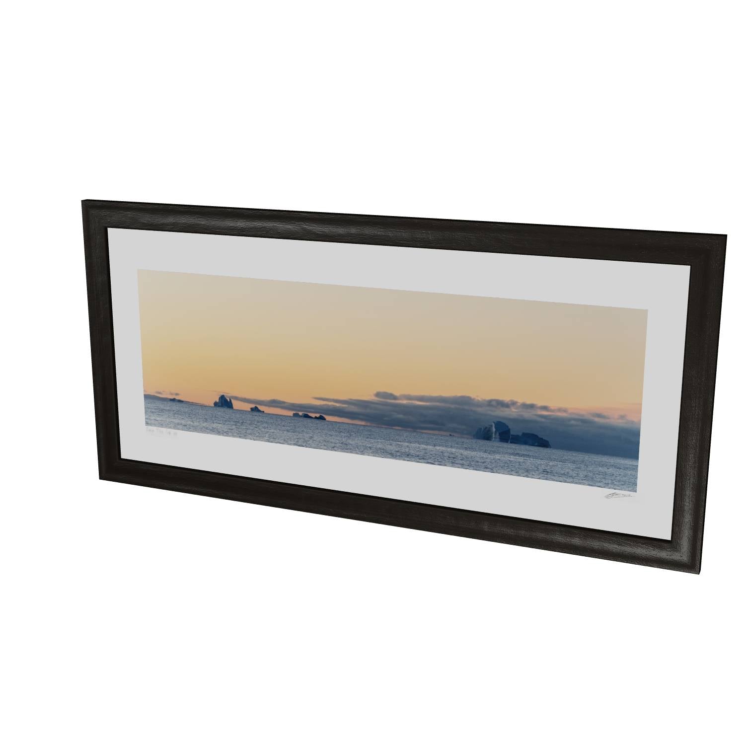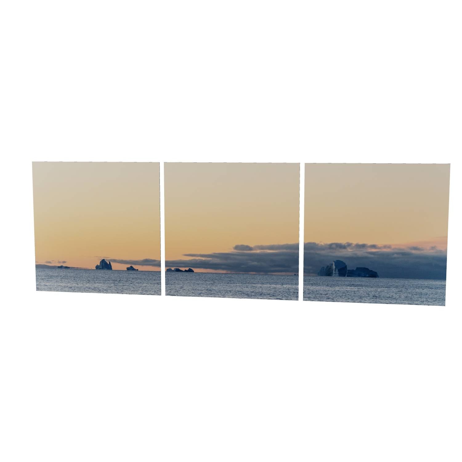 There's something quietly powerful about watching icebergs drift across a calm sea as the day fades. This image from Scoresby Sund in Greenland captures that fleeting moment when warm peach tones spread across the sky and meet the cool grey of the water below. The icebergs sit along the horizon like ancient monuments, their white forms catching the last light. The panoramic format gives this print a sense of scale that works well on a wall, drawing the eye across the scene from left to right. It's a reminder of how vast and unhurried these landscapes can be—the kind of image that brings a bit of calm to any room it hangs in.
