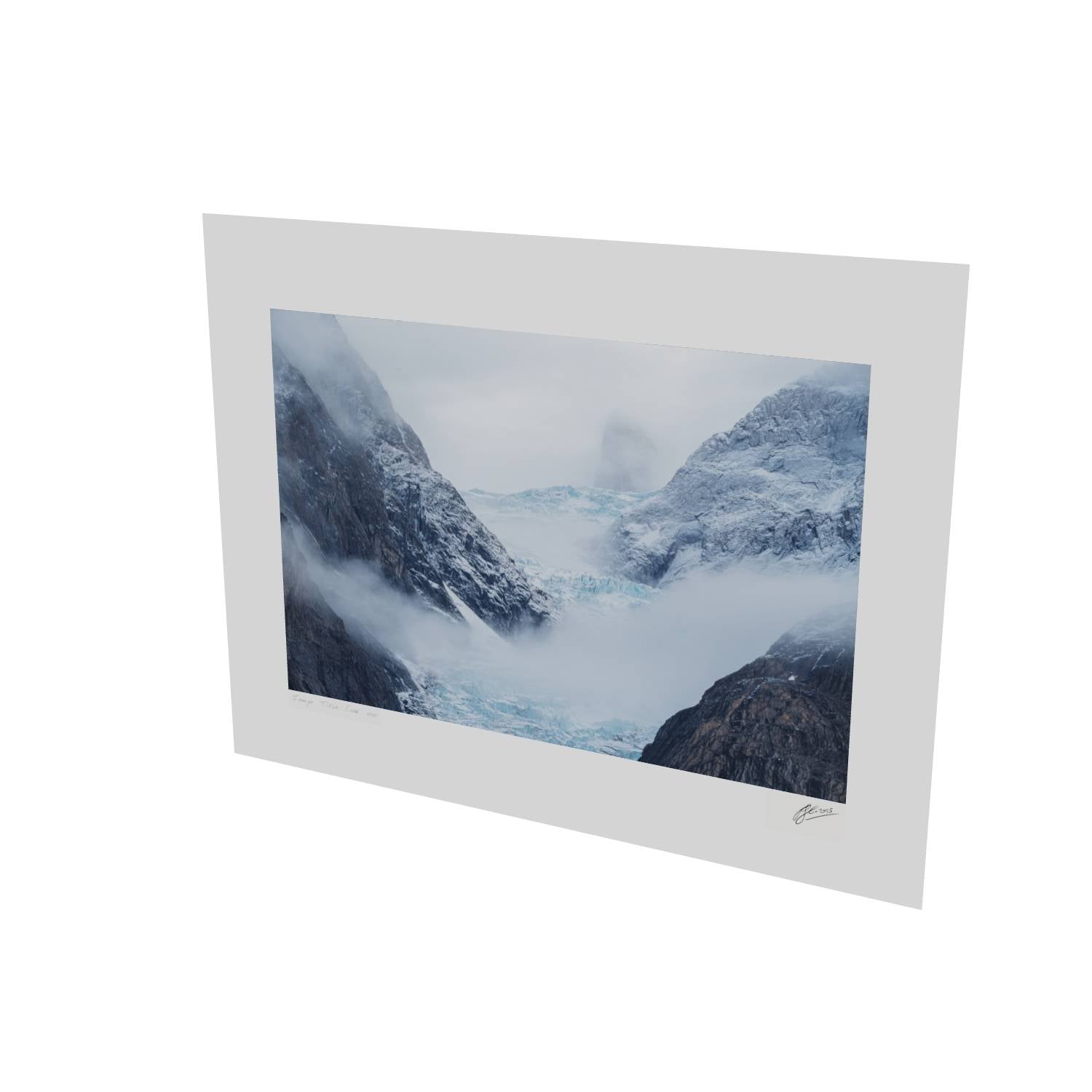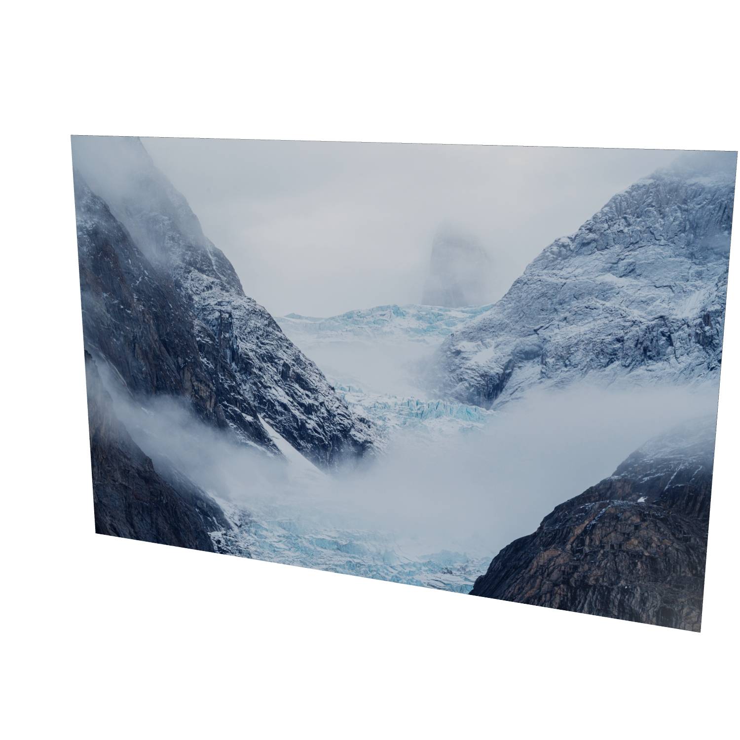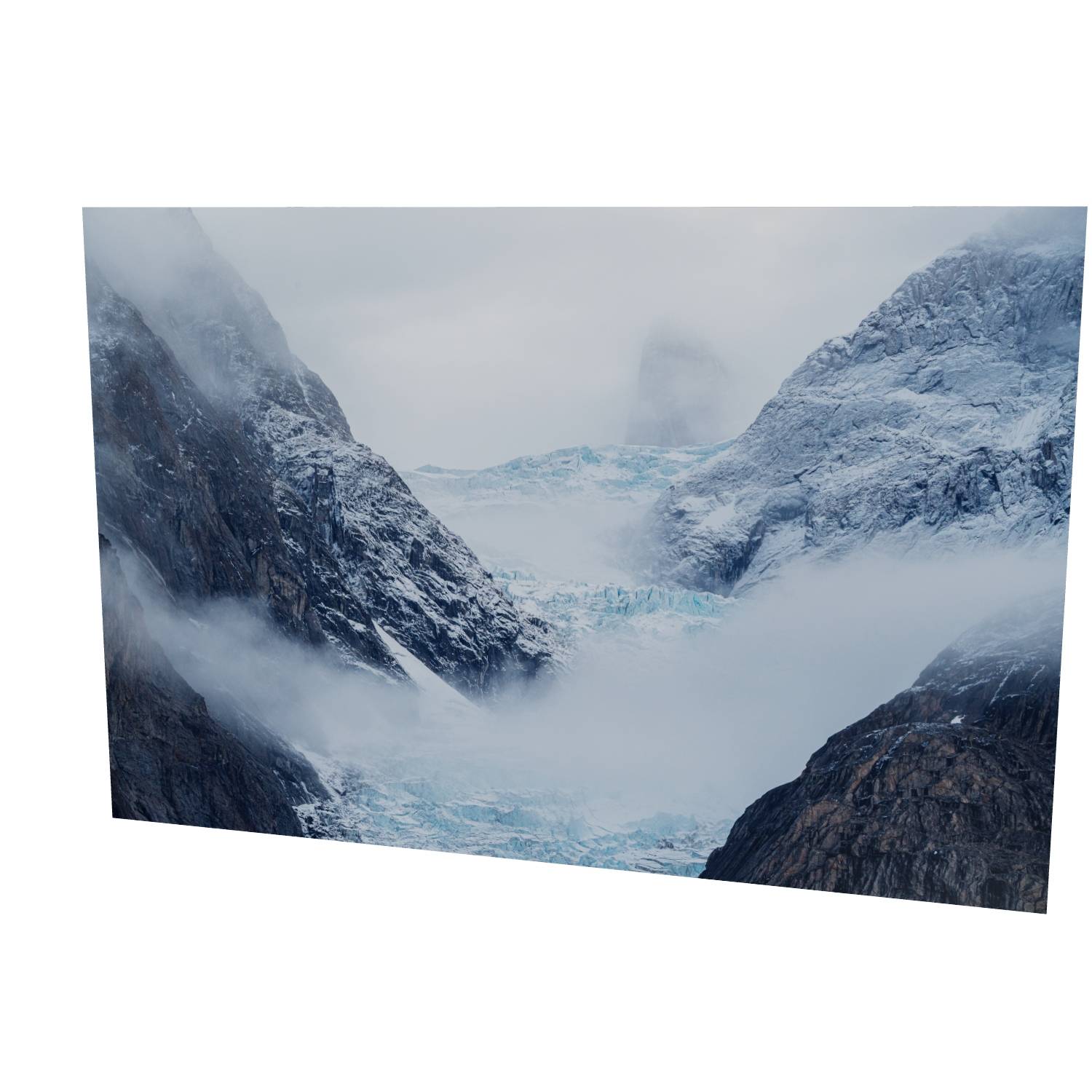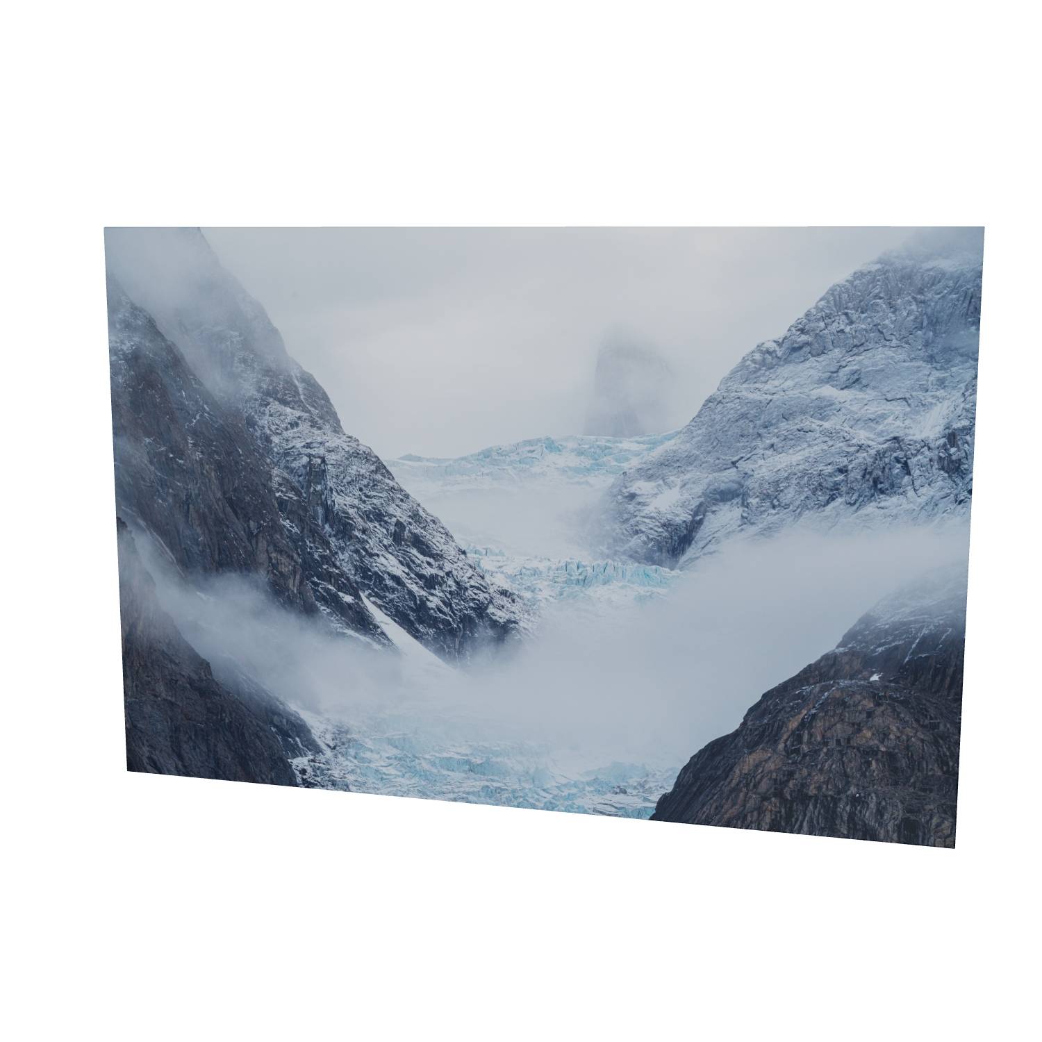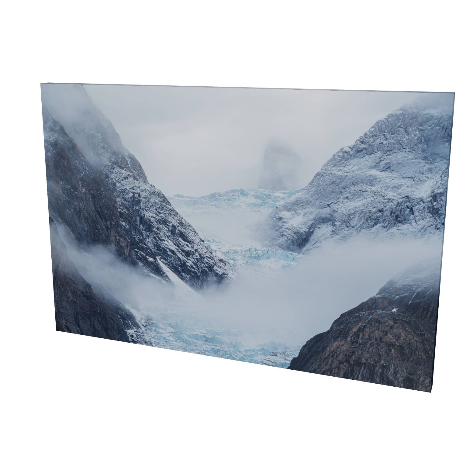 Mist rolls through a glacial valley in Scoresby Sund, Greenland, revealing just enough of the scene to draw you in. The blue ice of the glacier sits cradled between dark, weathered rock faces while a lone peak emerges ghost-like through the cloud above. There's something quietly powerful about catching a landscape in this half-hidden state—the way the fog softens edges and creates depth where usually there would be harsh contrast. This fine art landscape print captures the raw, remote beauty of Greenland's eastern coast. The muted palette of slate grey, ice blue, and snow white makes it a striking piece for any room, bringing a sense of calm and scale that only wild places can offer.