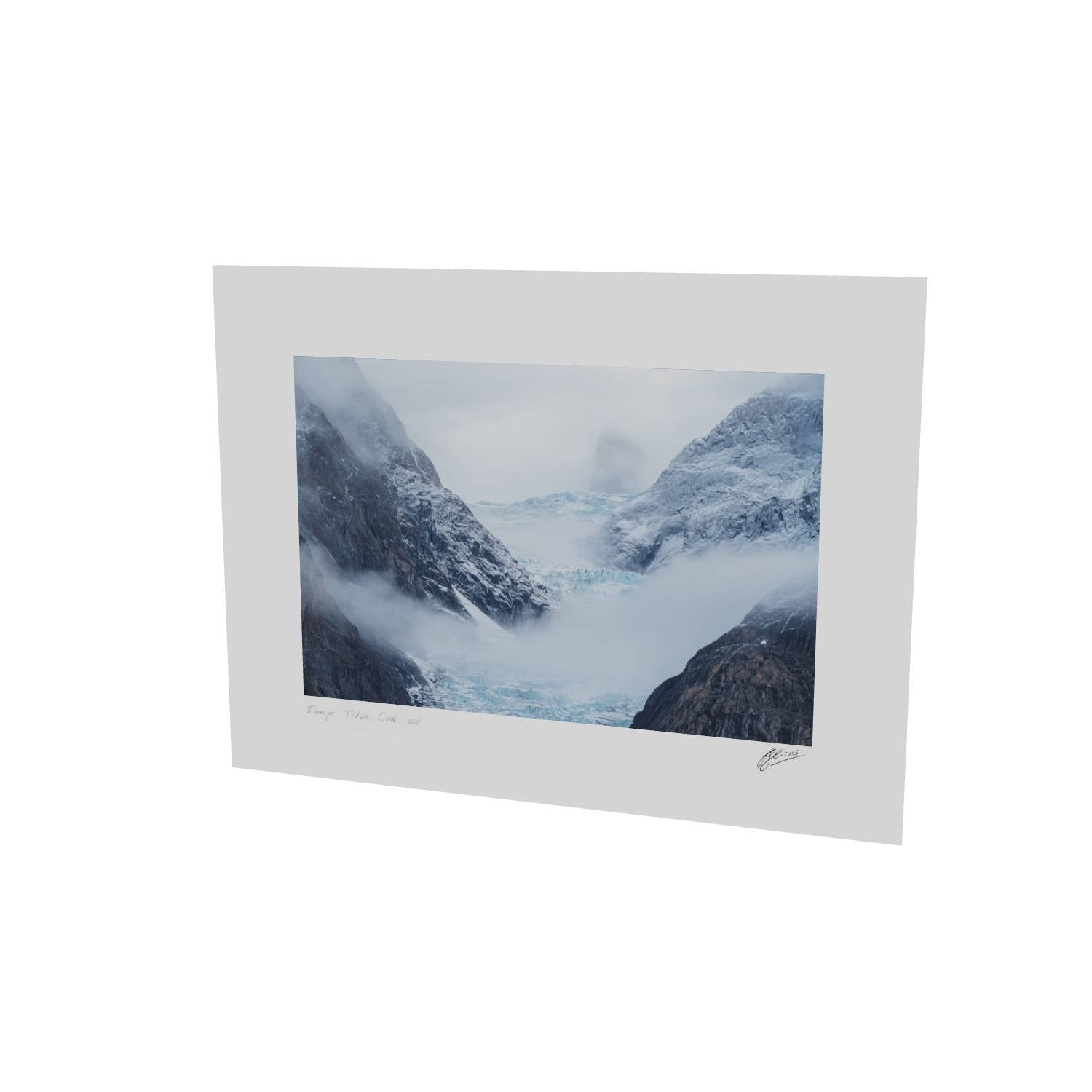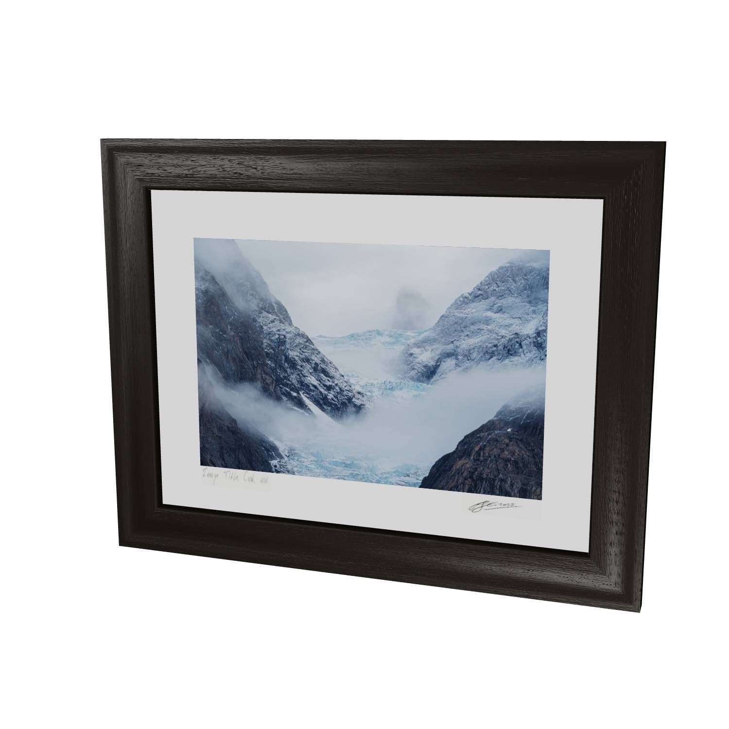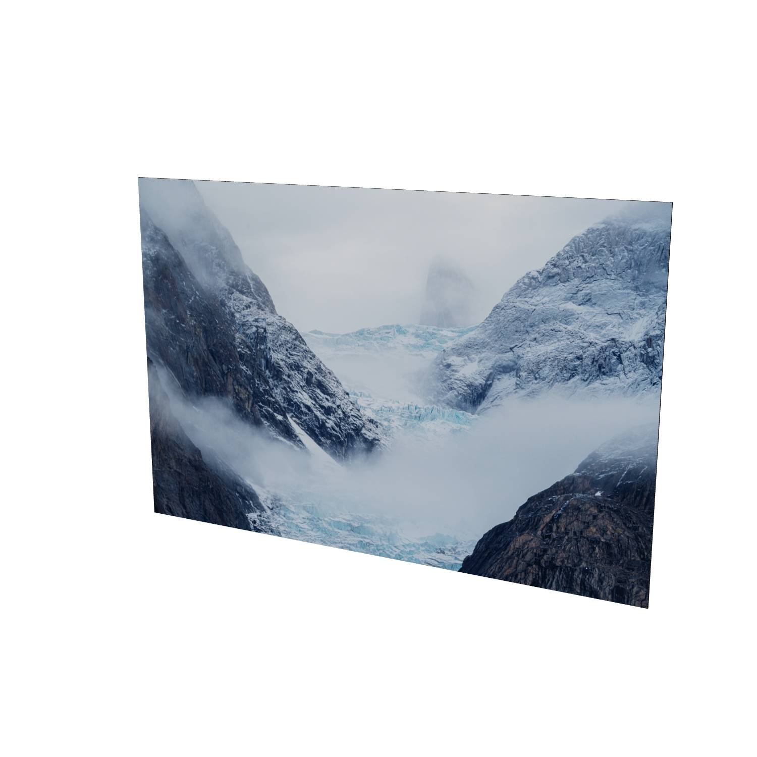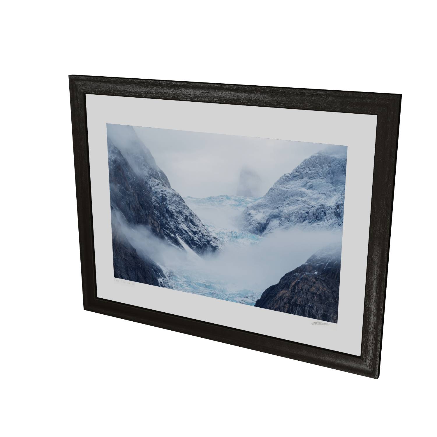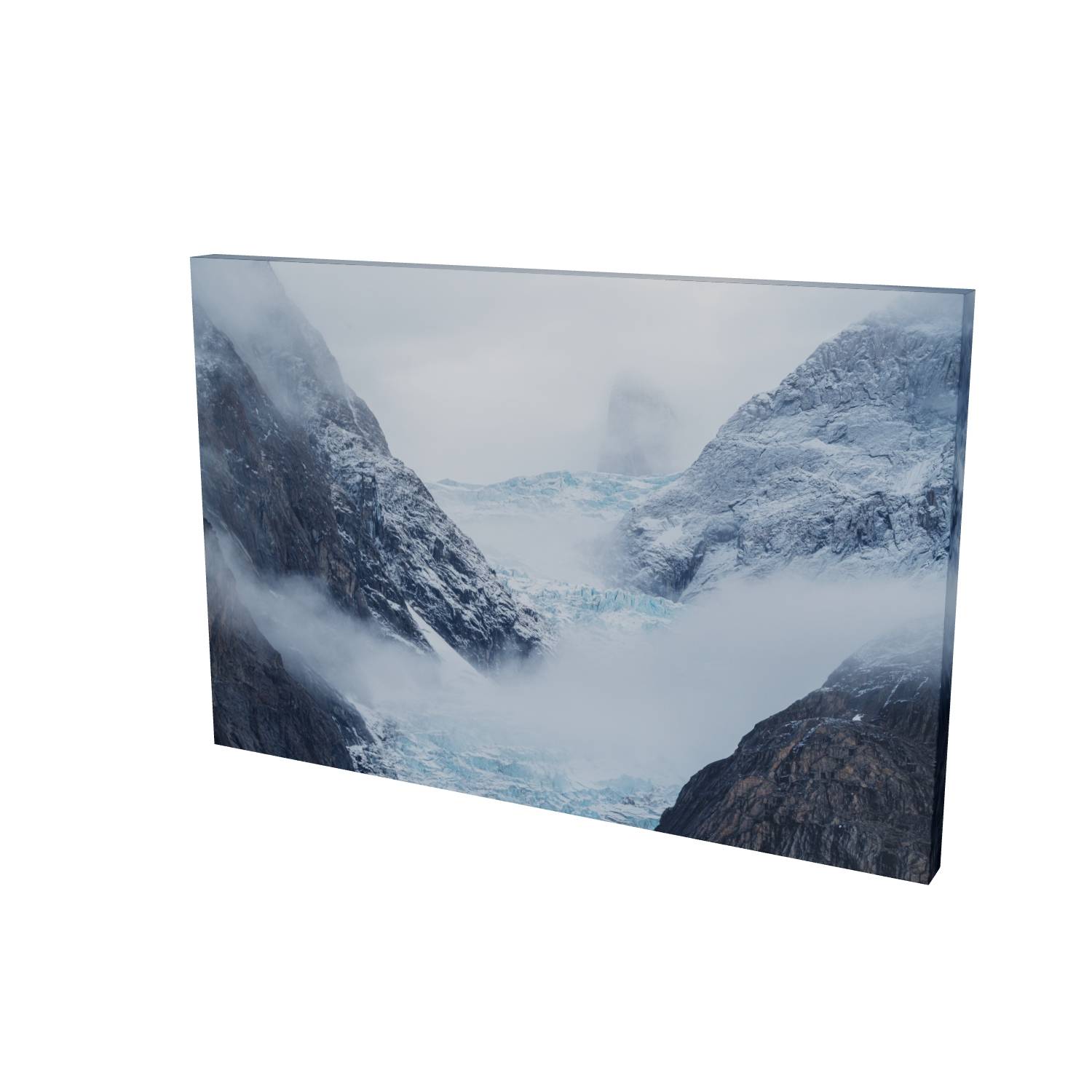 Mist rolls through a glacial valley in Scoresby Sund, Greenland, revealing just enough of the scene to draw you in. The blue ice of the glacier sits cradled between dark, weathered rock faces while a lone peak emerges ghost-like through the cloud above. There's something quietly powerful about catching a landscape in this half-hidden state—the way the fog softens edges and creates depth where usually there would be harsh contrast. This fine art landscape print captures the raw, remote beauty of Greenland's eastern coast. The muted palette of slate grey, ice blue, and snow white makes it a striking piece for any room, bringing a sense of calm and scale that only wild places can offer.