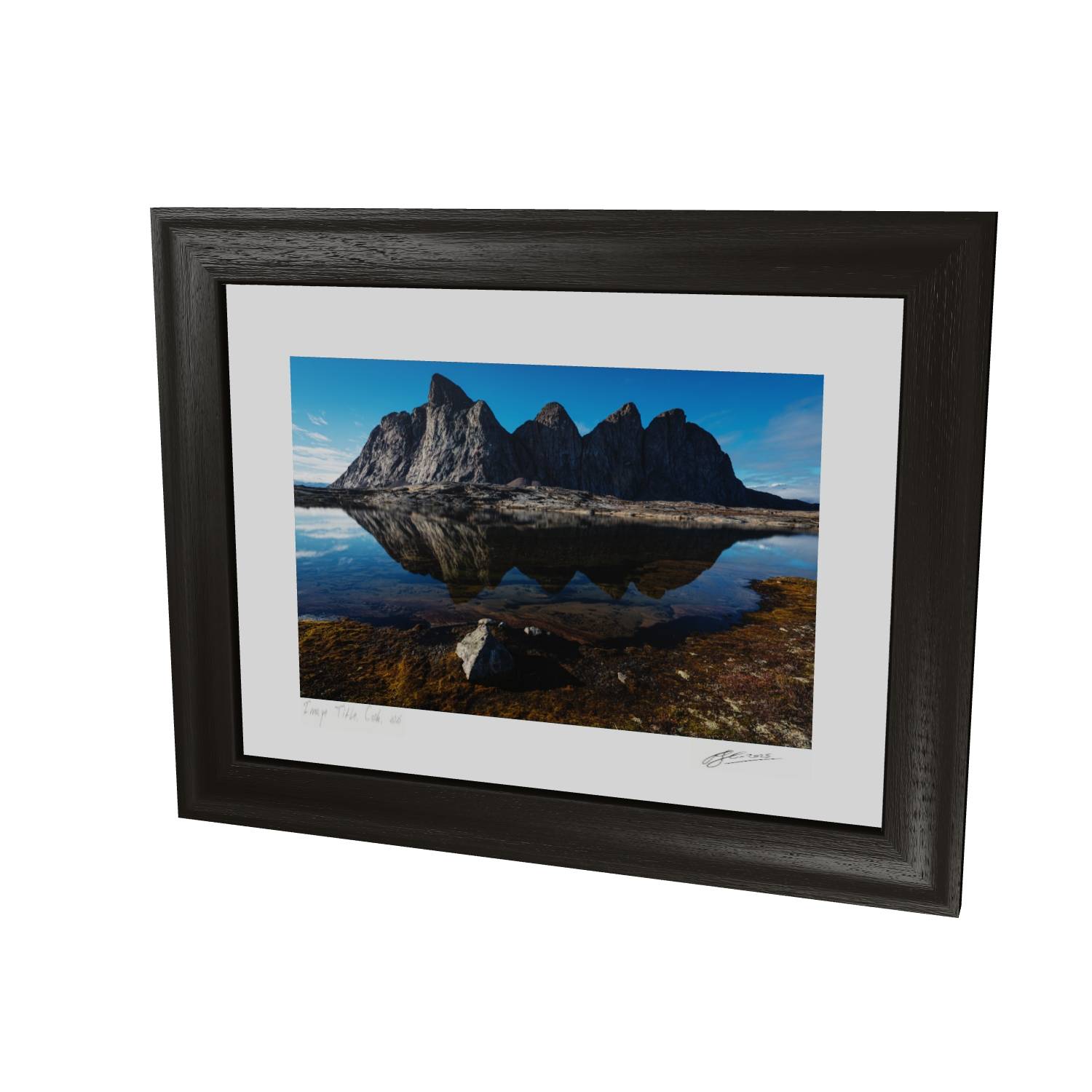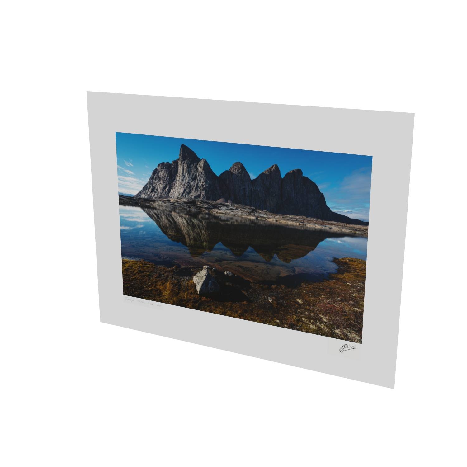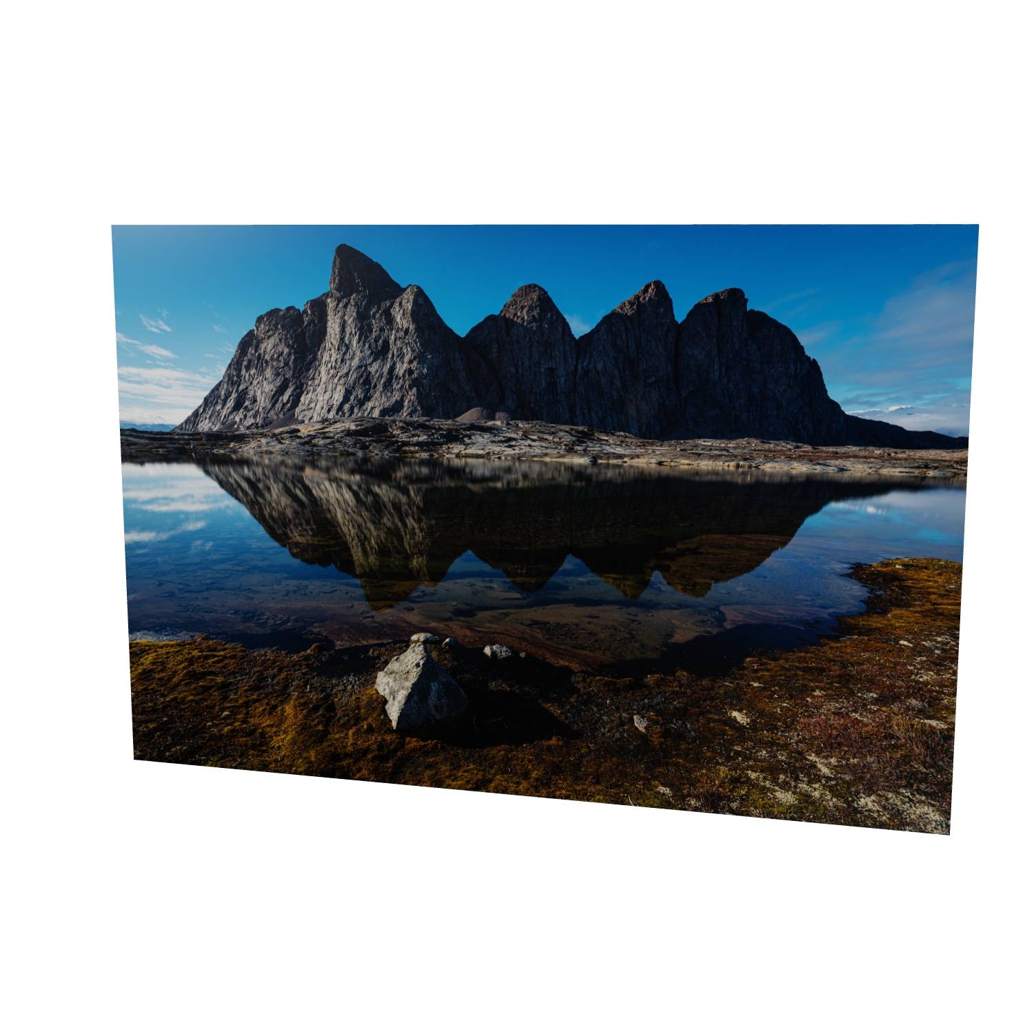There's something hypnotic about a perfect reflection. These rugged peaks in Scoresby Sund, Greenland, rise sharply from the earth and then repeat themselves in mirror image across the still water below. The symmetry draws your eye in, while the raw texture of the rock face keeps things grounded and real. The shallow foreground, with its mossy greens and scattered stones visible beneath the surface, adds depth to the scene and connects you to this remote Arctic landscape. This fine art print captures a fleeting moment of calm in one of the world's most dramatic fjord systems—a striking piece for anyone drawn to wild, untouched places.