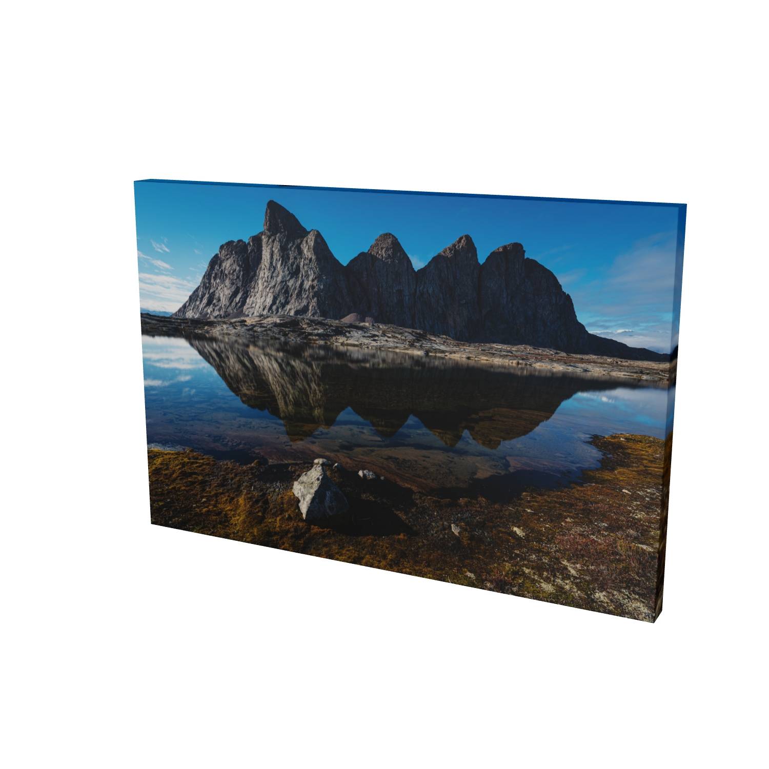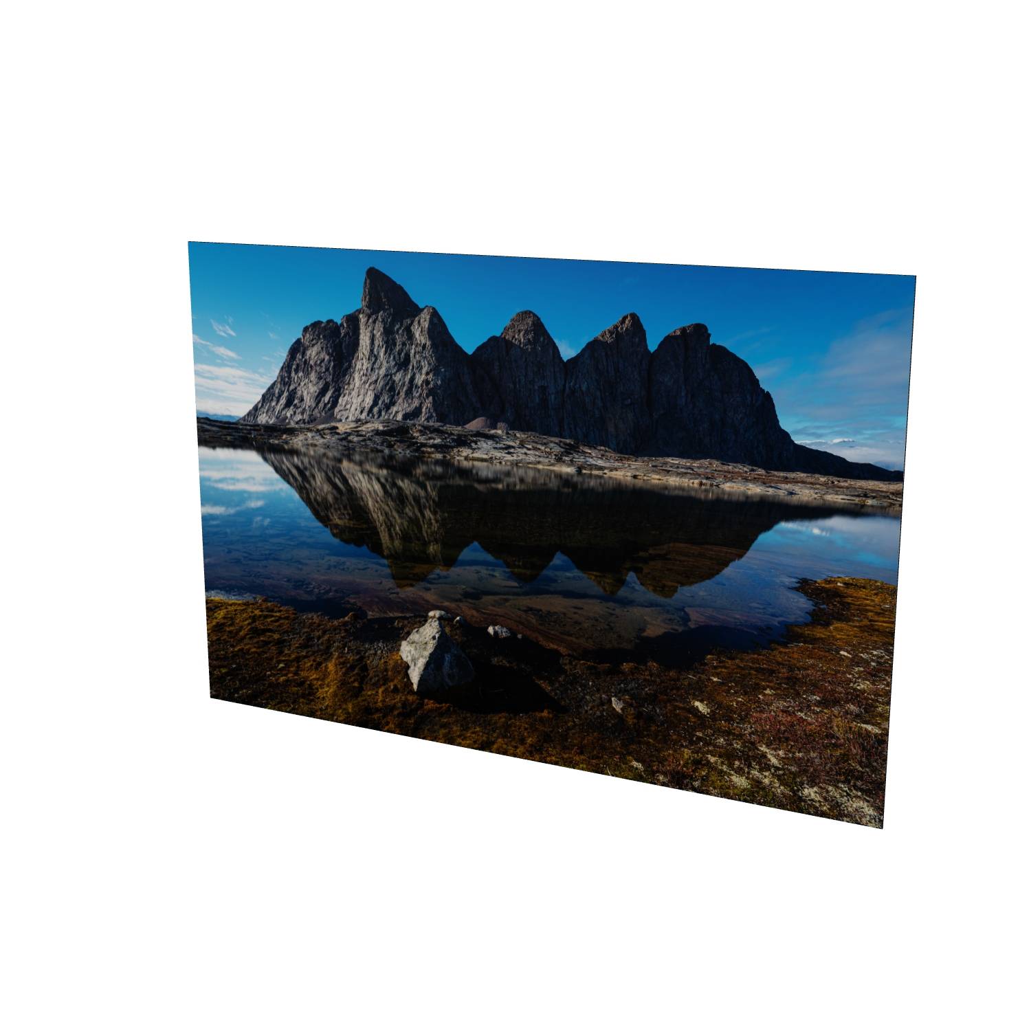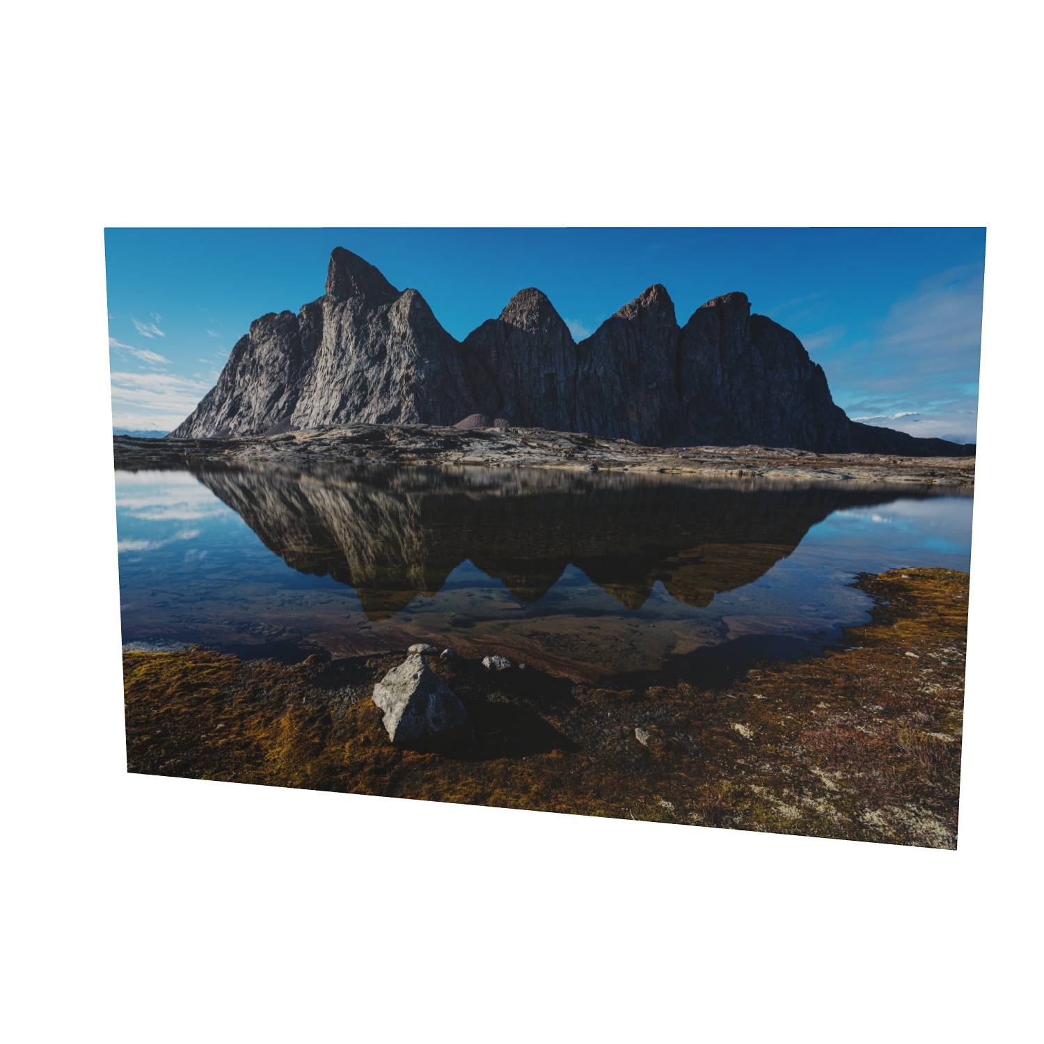 There's something hypnotic about a perfect reflection. These rugged peaks in Scoresby Sund, Greenland, rise sharply from the earth and then repeat themselves in mirror image across the still water below. The symmetry draws your eye in, while the raw texture of the rock face keeps things grounded and real. The shallow foreground, with its mossy greens and scattered stones visible beneath the surface, adds depth to the scene and connects you to this remote Arctic landscape. This fine art print captures a fleeting moment of calm in one of the world's most dramatic fjord systems—a striking piece for anyone drawn to wild, untouched places.