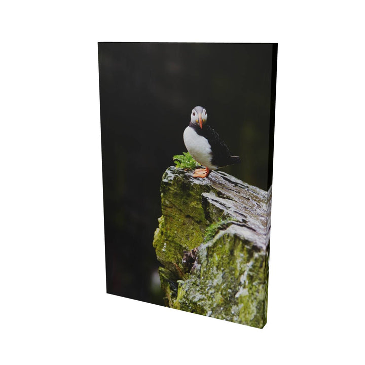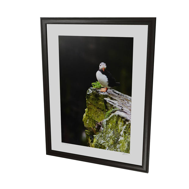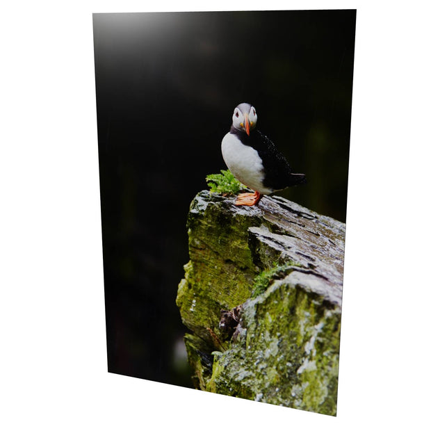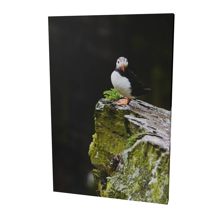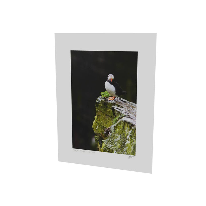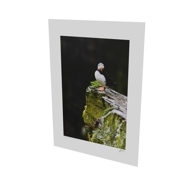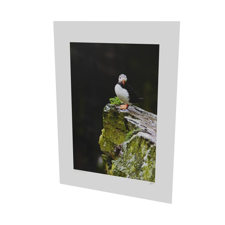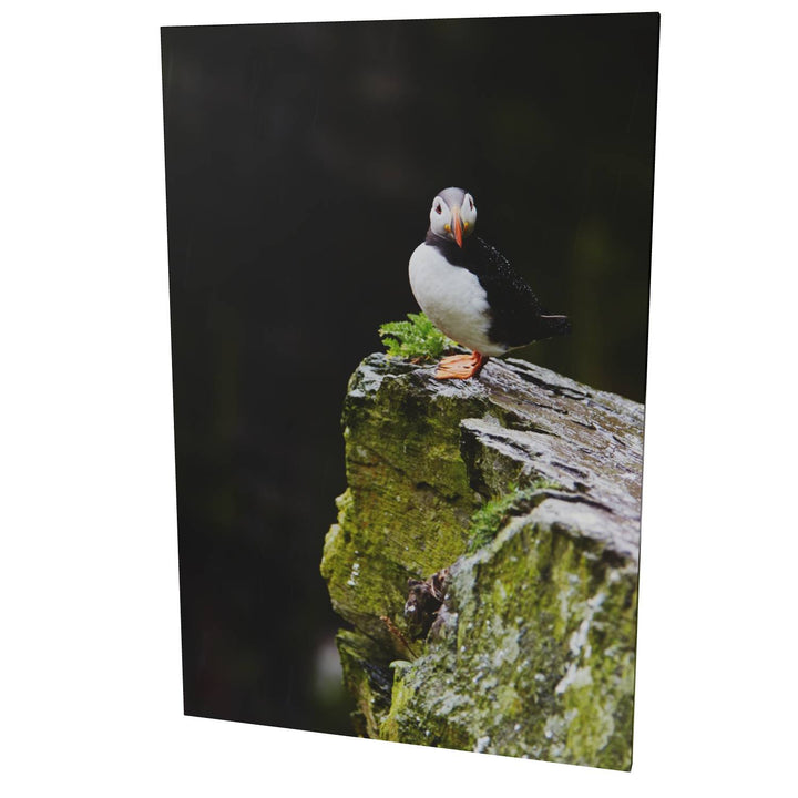 A lone puffin stands resilient in the gentle rain, its bright orange beak and feet vivid against the damp, moss-covered rock of Skellig Michael. The bird gazes steadily ahead, unfazed by the drizzle, as if contemplating the mysteries of this ancient landscape. In the summer, these rugged cliffs are bustling with puffins, but in this moment, this one captures the spotlight. Imagine how beautifully this print would accent your space, adding a touch of nature's drama and color.