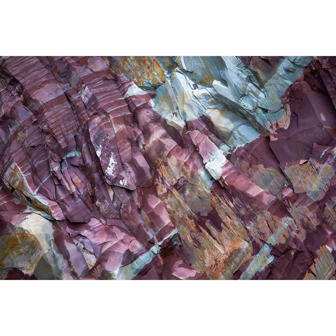 Immerse yourself in the breathtaking textures and colors of Murchisonfjorden's rocky surfaces. The rich purples, blues, and rusty oranges intertwine in intricate patterns, creating a mesmerizing tapestry that invites you to delve deeper into its natural beauty. Imagine this captivating print bringing a dynamic touch to your living space, an ever-present reminder of nature's artistry.