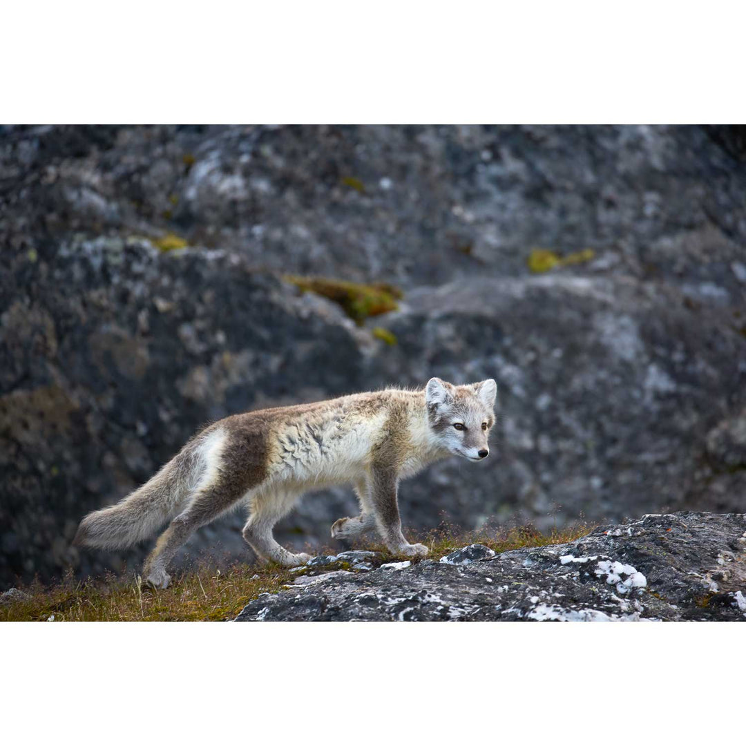 In this captivating image, a young arctic fox explores the rugged terrain of Alkhornet, framed beautifully against the textured backdrop of ancient rocks. The contrasting tones capture the essence of the Arctic wilderness, providing a glimpse into the life and habitat of this charming creature. Imagine this striking scene hanging on your wall, bringing a touch of the wild Arctic landscapes into your home.