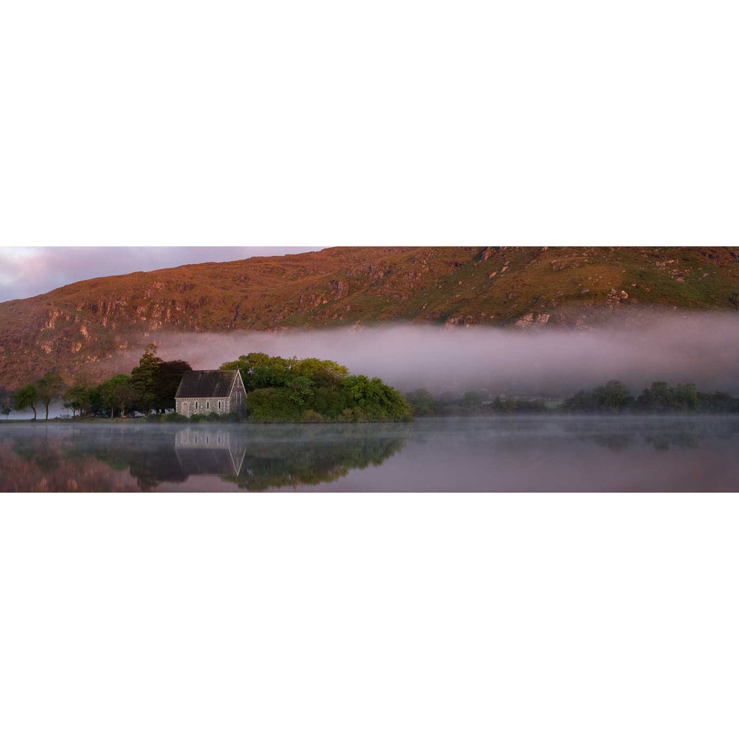Morning mists rise above a calm Gougane Barra.
